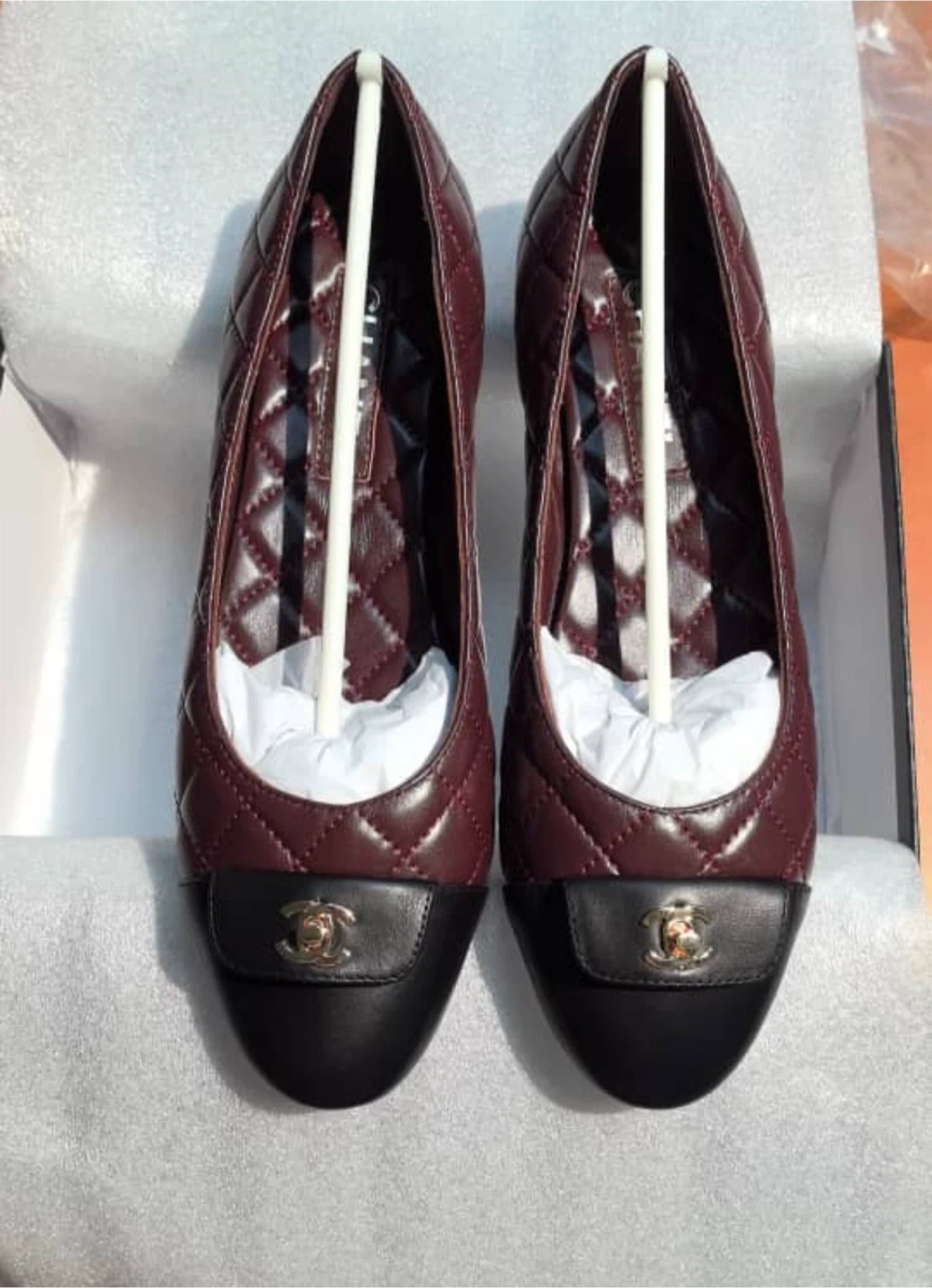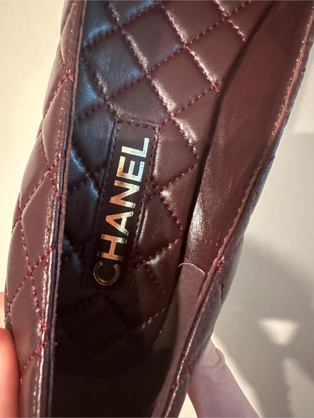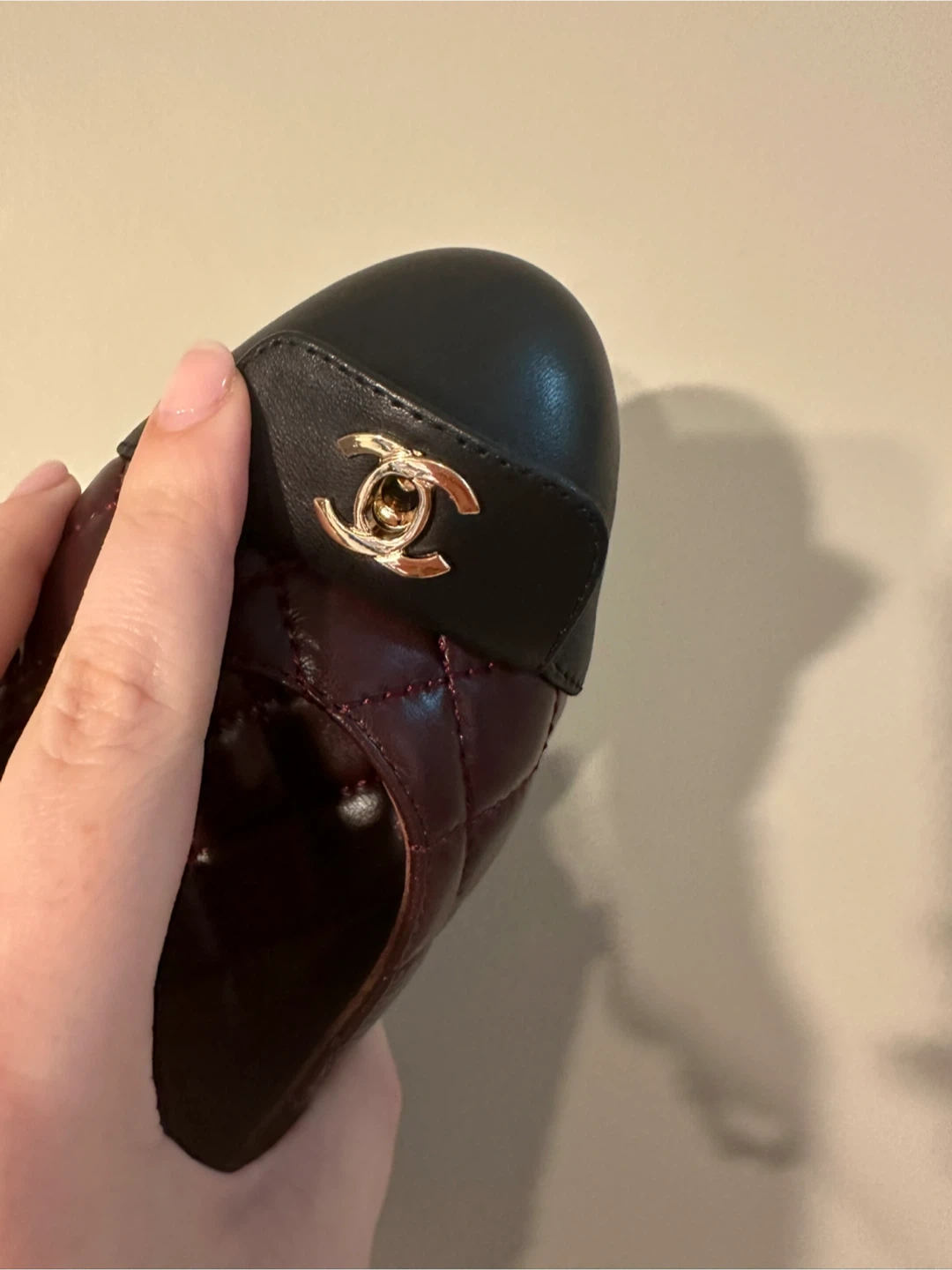 Elegant CHANEL ballet flats featuring a quilted burgundy leather upper and a contrasting black cap toe. These stylish shoes have a gold-tone CC logo accent and come in their box with a dust bag . They're made from genuine leather. D u p e. Size 9 US. Pick up downtown only.