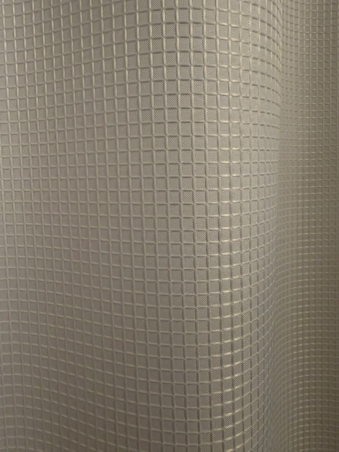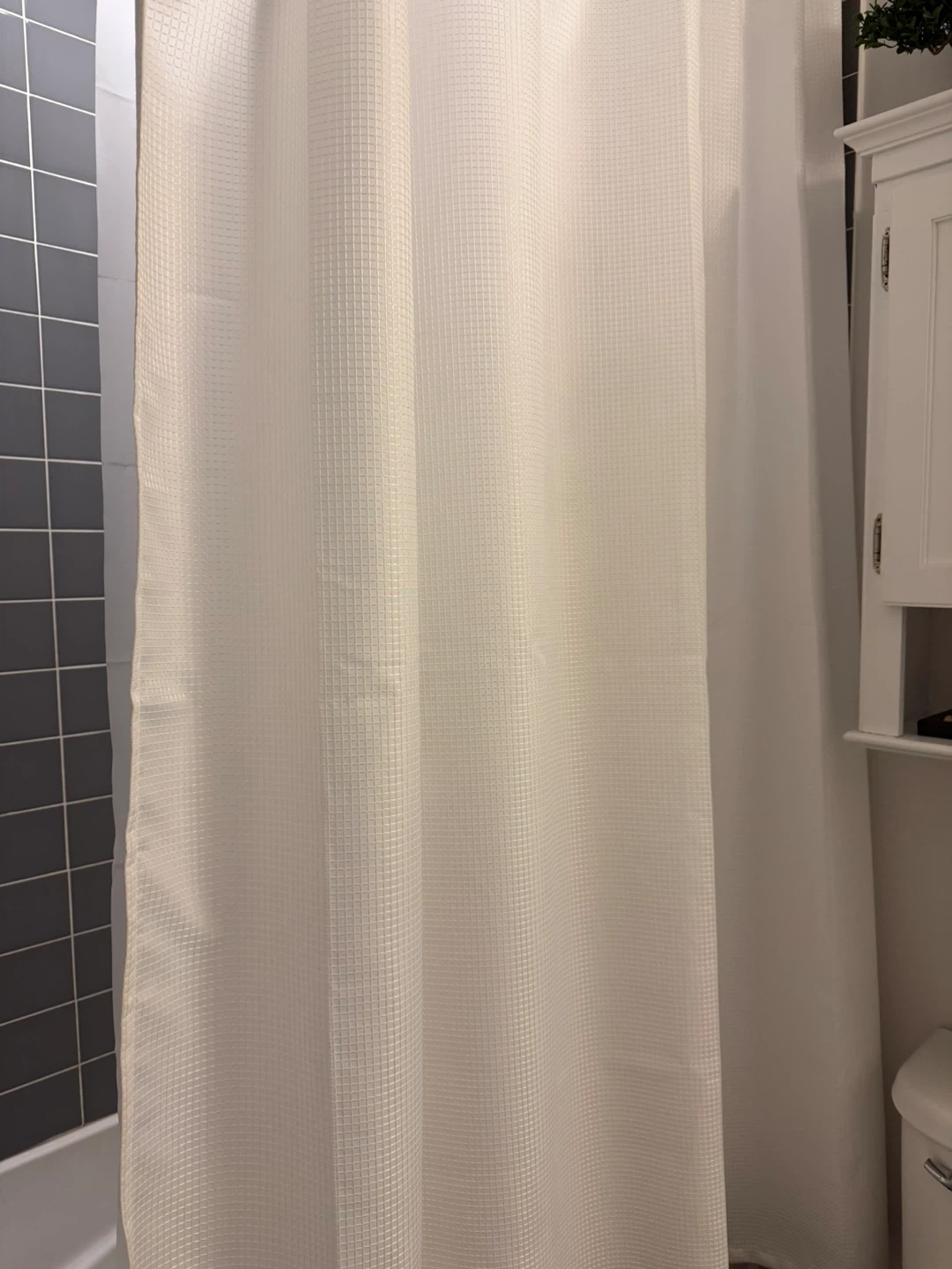 Here's a simple white waffle shower curtain to brighten up your bathroom. It's in great condition and ready to use!