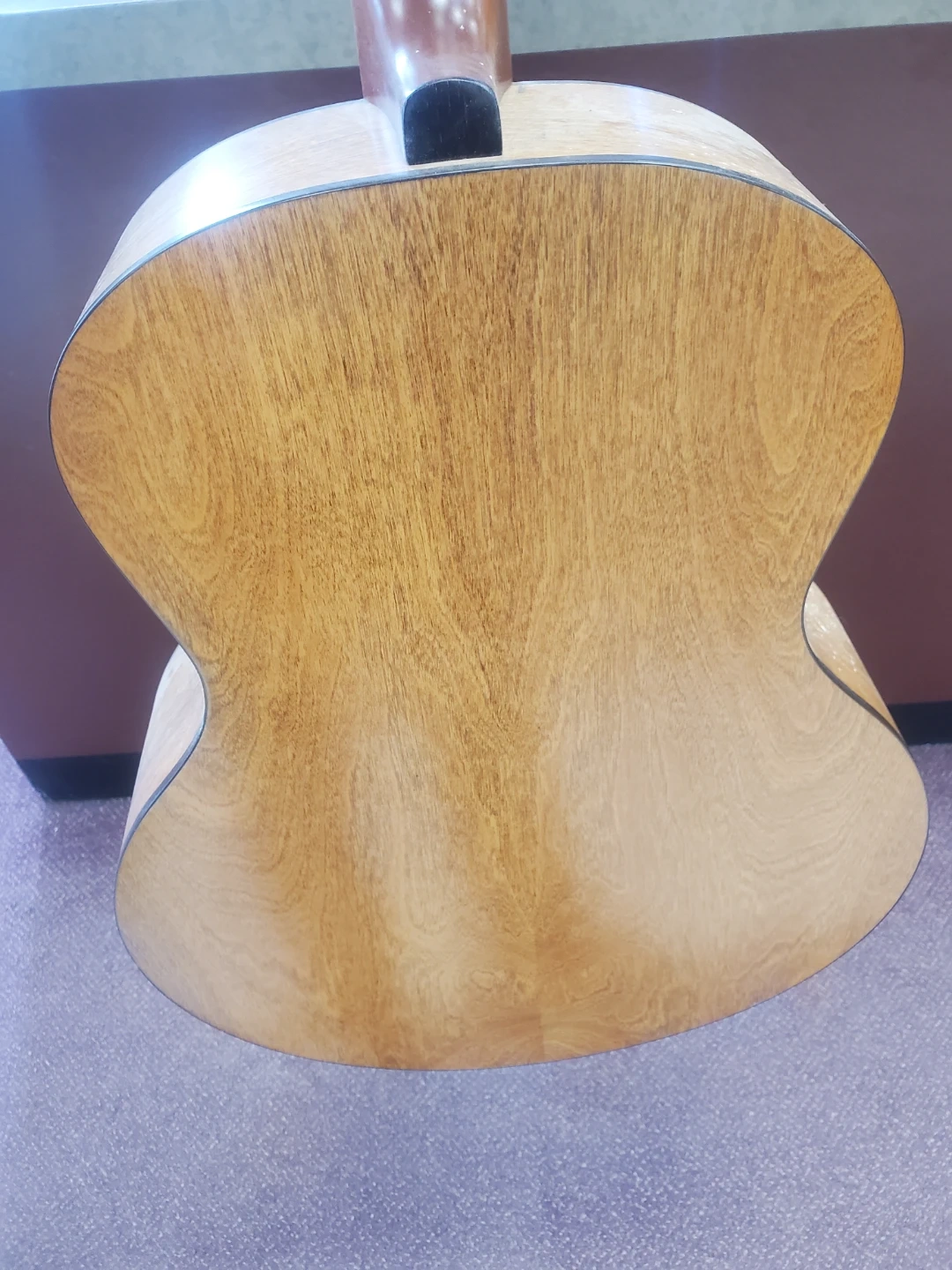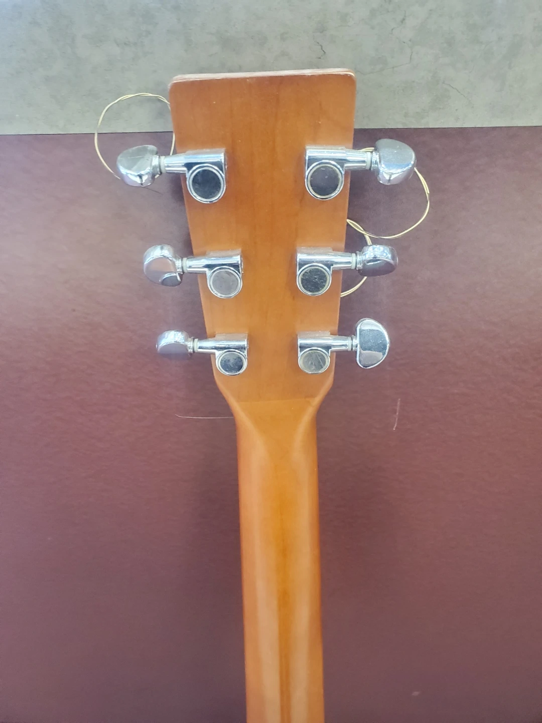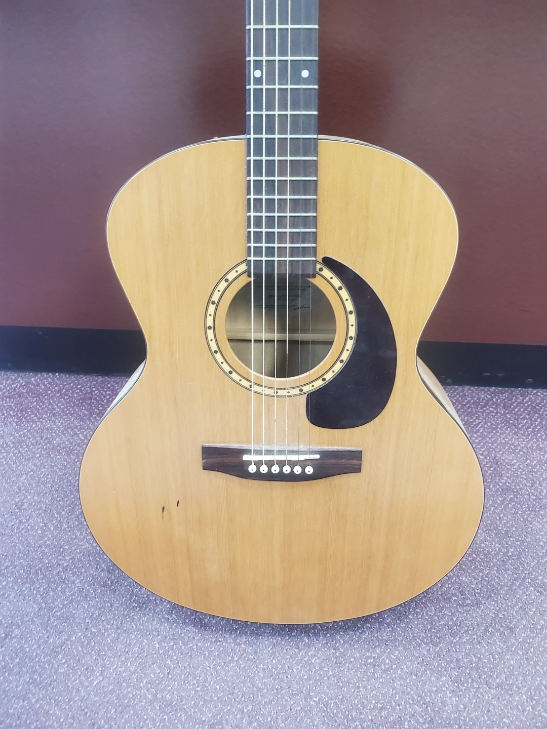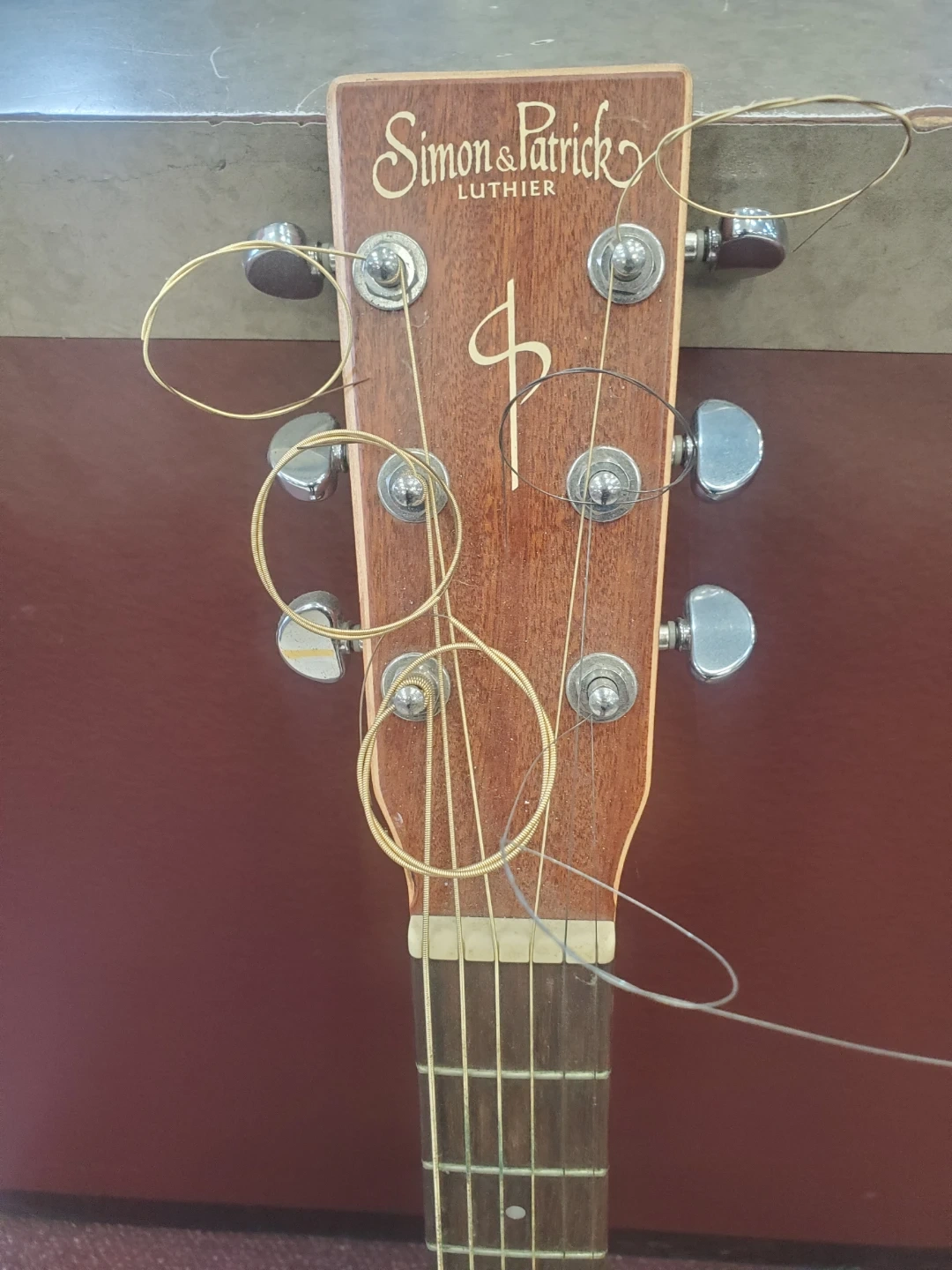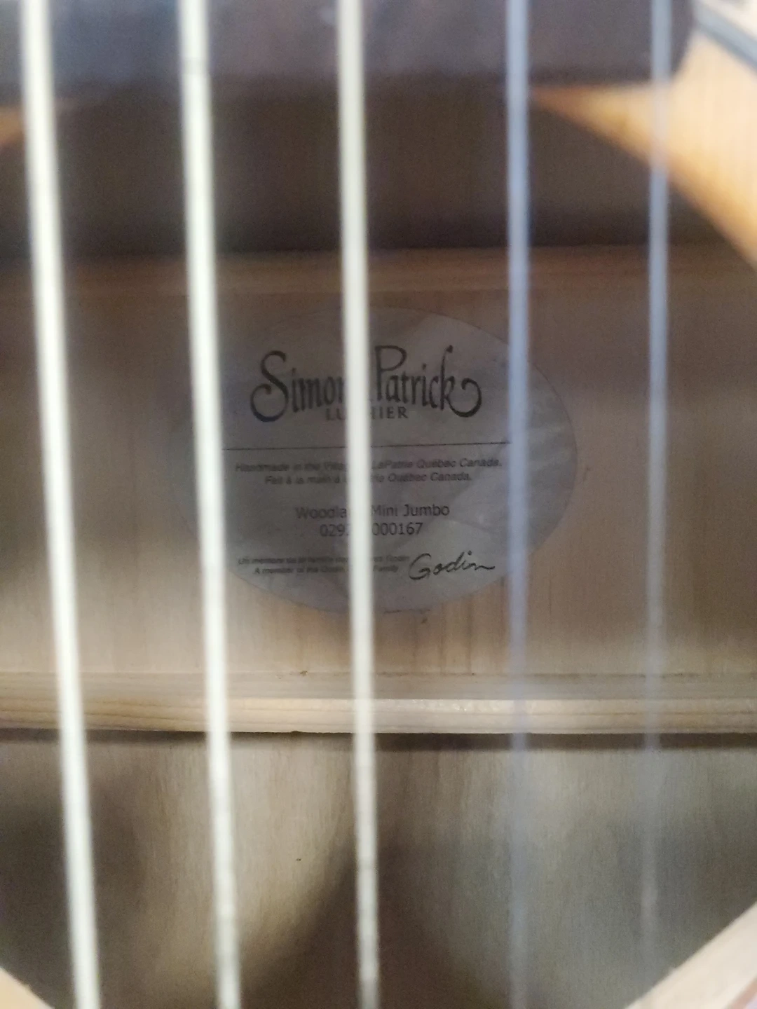 Simon & Patrick Luthier acoustic guitar in a natural wood finish. It's a Woodland Mini Jumbo model. This guitar is fair condition.
