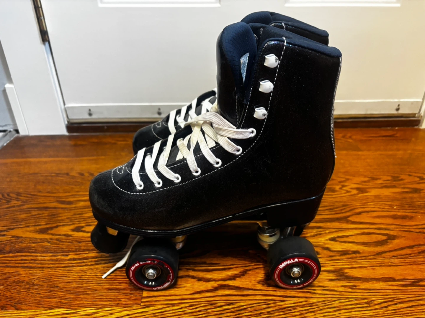 Impala roller skates in a black sparkle finish. These skates have white laces and black wheels. They're designed for comfort and style on the rink or boardwalk.