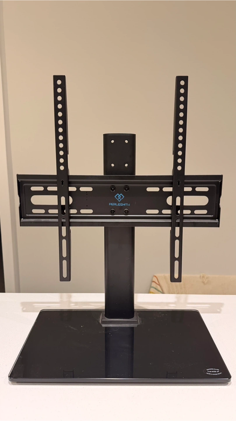 PERLESMITH universal TV stand with adjustable height. This stand fits most 32-60” inch TVs. It features a stable base and easy assembly. Great for placing your TV on a dresser or entertainment center!