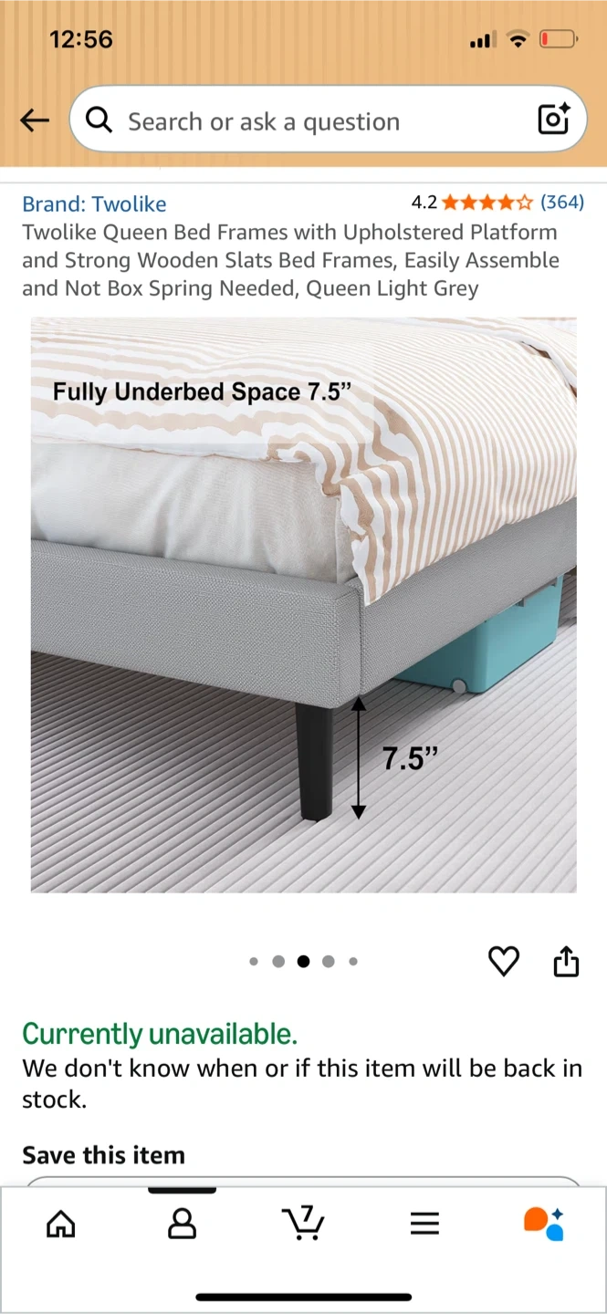 This is a Twolike queen bed frame with upholstered platform and strong wooden slats. It offers 7.5" of underbed storage space. Assembly is easy and no box spring is needed. Used only for two months.