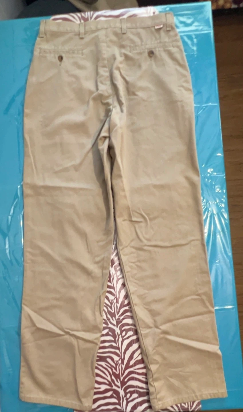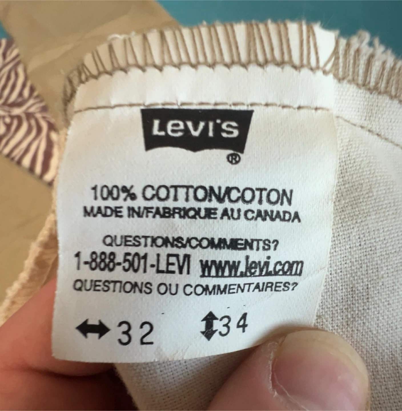 These Levi's pants are made from 100% cotton and manufactured in Canada. They're a khaki colour. Waist is 32 inches with a 34 inch inseam. These pants are suitable for everyday wear.