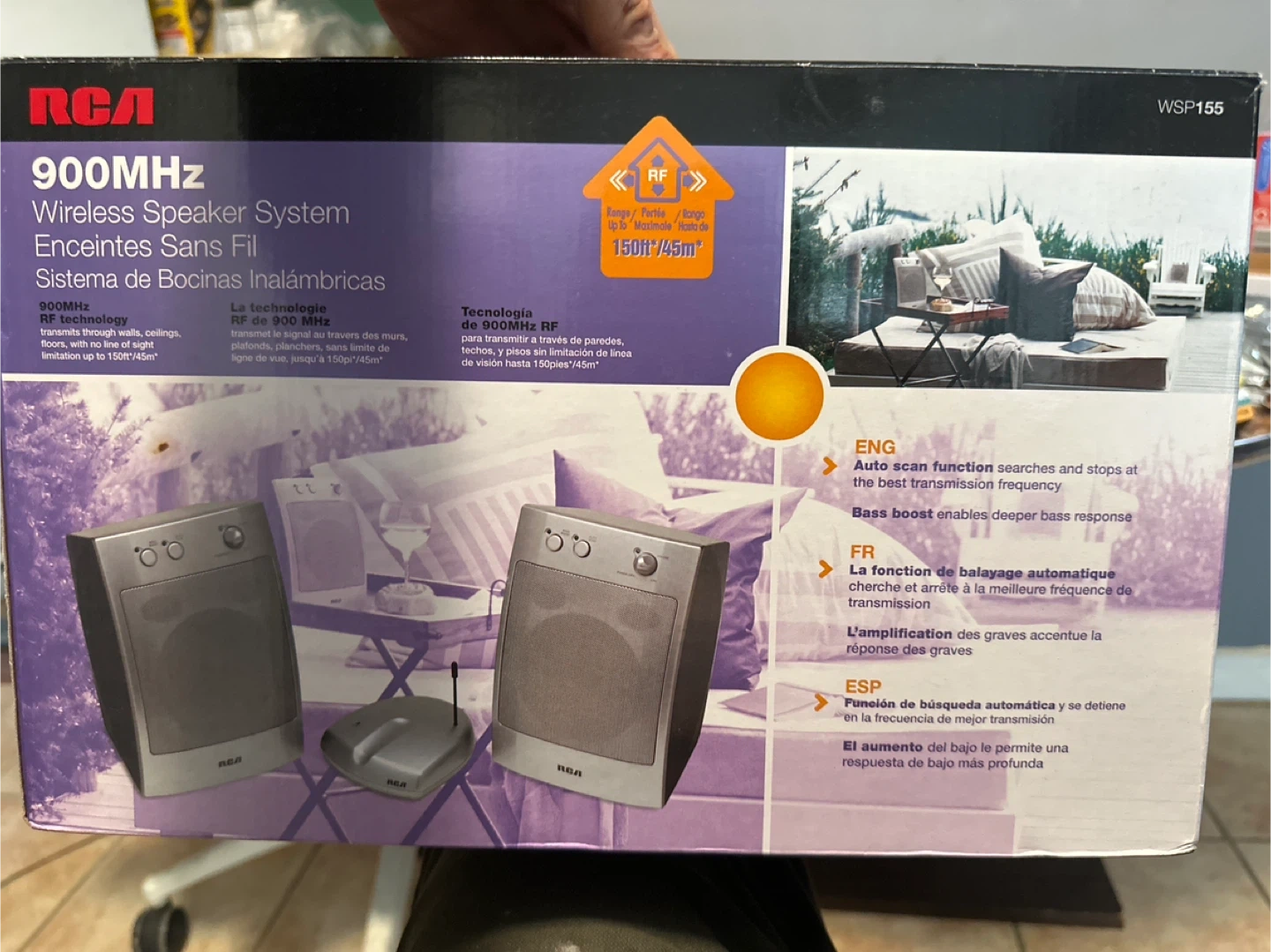 This RCA wireless speaker system operates on 900MHz RF technology. It transmits through walls, ceilings, and floors with no line of sight limitation up to 150ft. The auto scan function finds the best transmission frequency and it has a bass boost for deeper response.