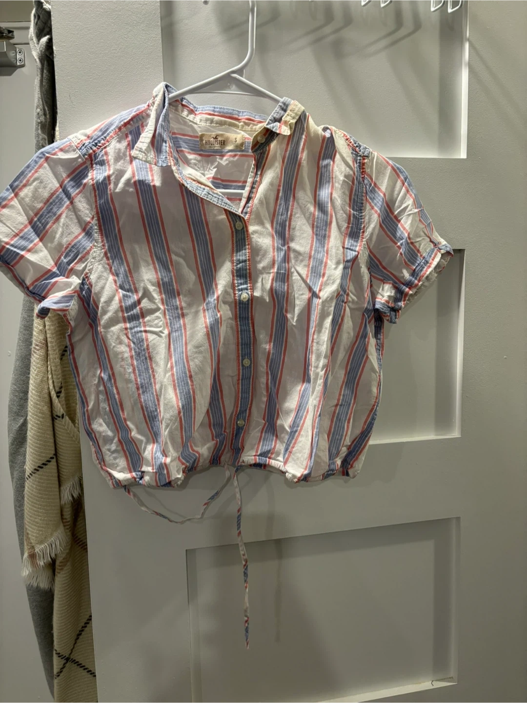 This is a Hollister crop shirt. It's a size small and features blue and red stripes. The shirt has a tie at the waist for a cinched look. Made with a lightweight fabric, it's great for warmer weather!