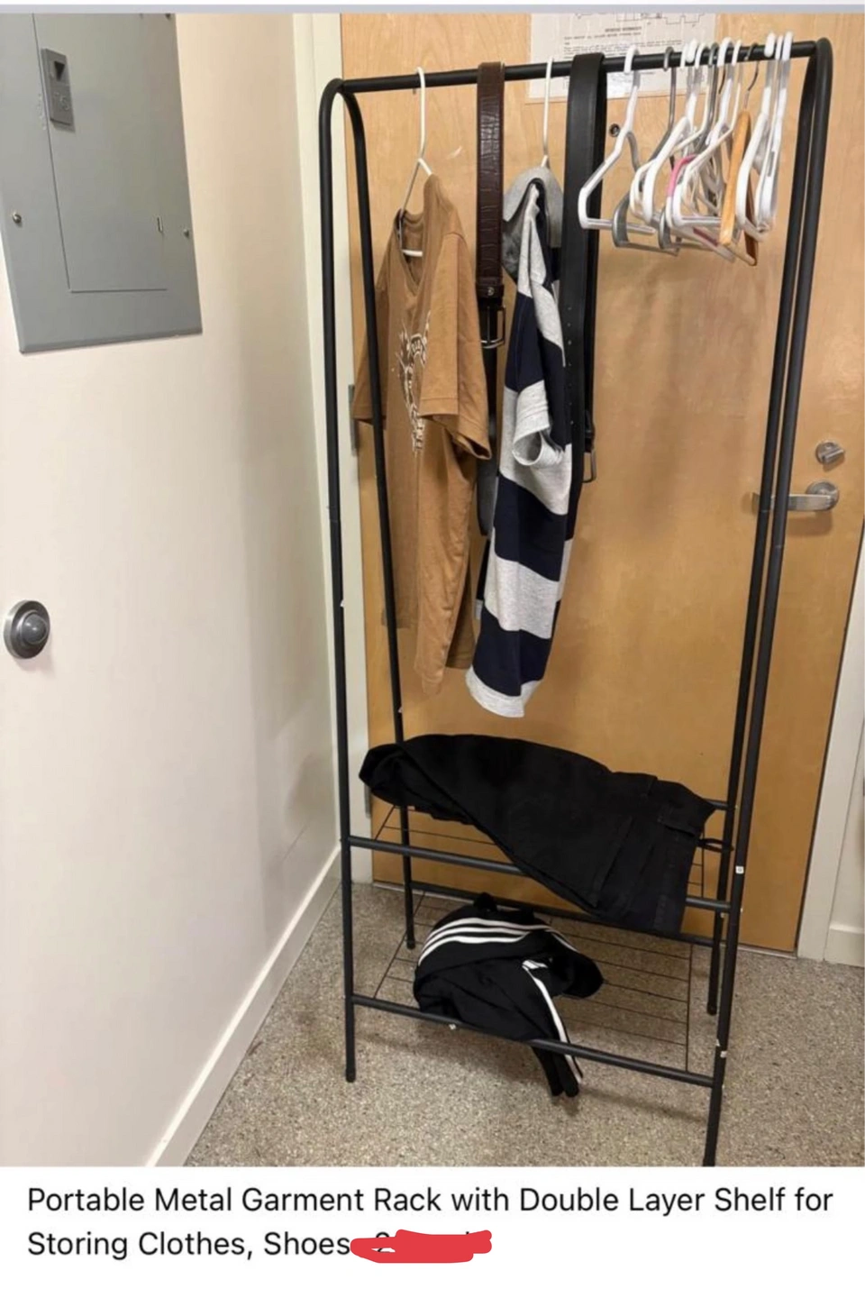 This portable metal garment rack is perfect for storing clothes and shoes. It features a hanging rail and two shelves for ample storage. Its lightweight design makes it easy to move around your space.