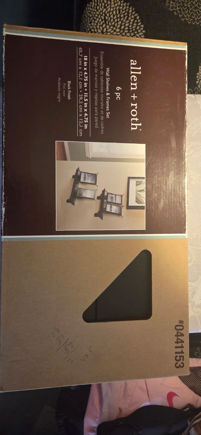 This is a 6 piece wall shelves and frames set from allen + roth. It includes two 18 in. x 3.75 in. shelves and four 11.5 in. x 4.75 in. frames. The finish is black. These are great for displaying photos and decor! 6 pics includes 2 shelves and 4 pictures frames.