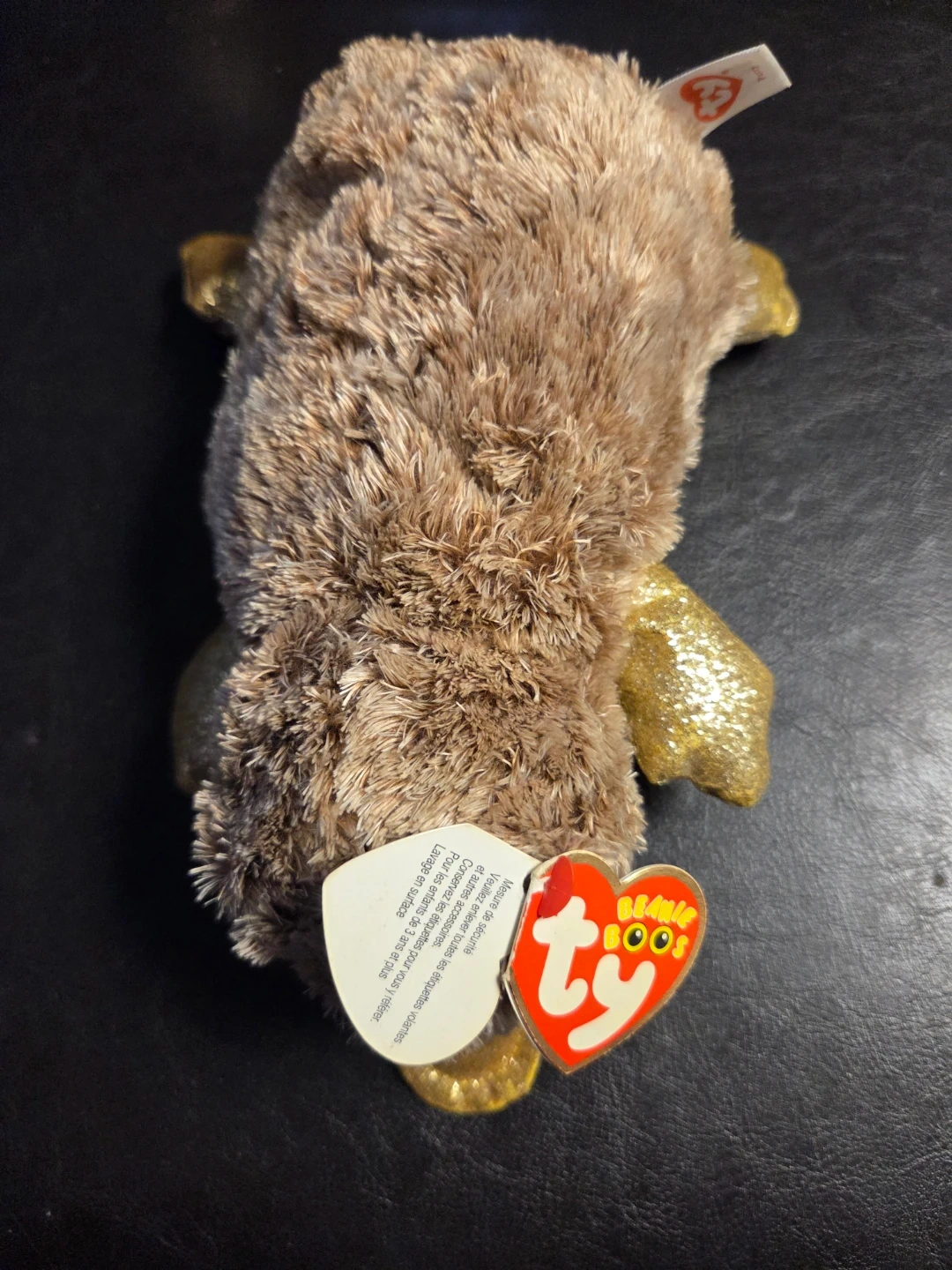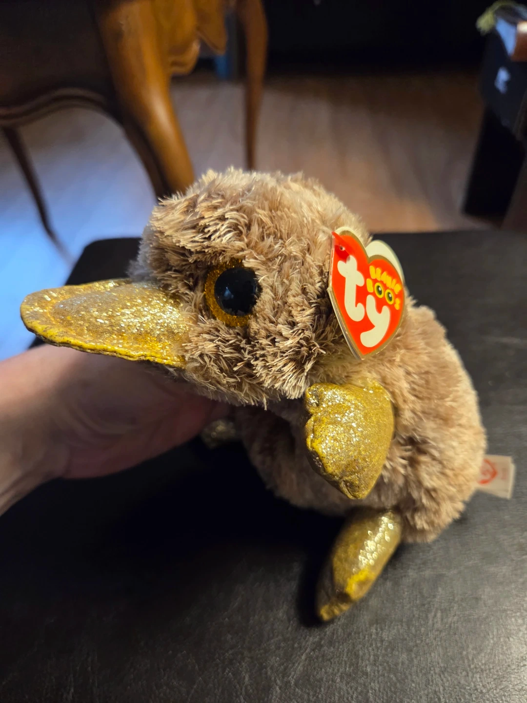 It's a fuzzy brown platypus Beanie Boo with glittery gold accents on its beak, flippers, and feet. This cute stuffed animal has big, sparkling eyes. It's perfect for collectors or as a cuddly friend!