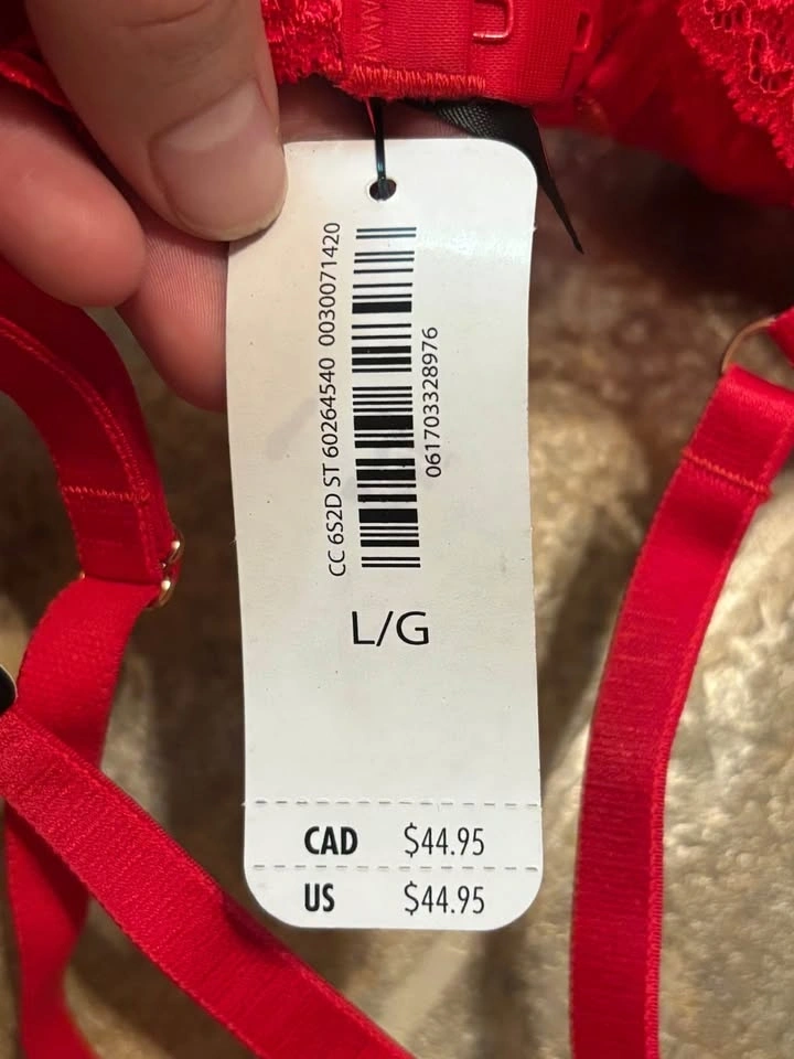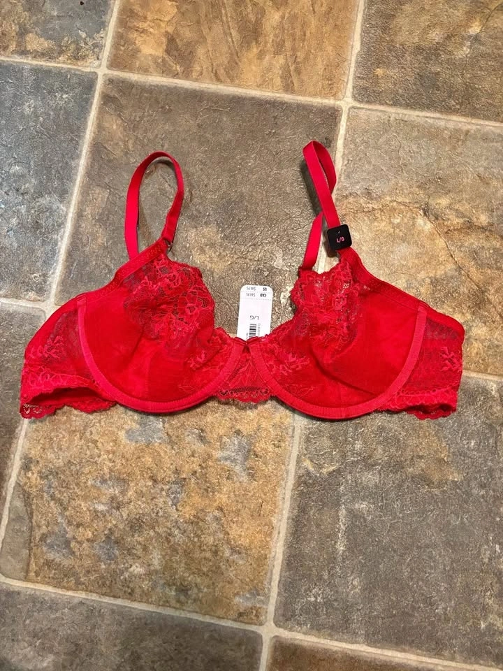 Brand: La Senza. Style: Unlined lace cups with underwire support for a natural silhouette. Color: Vibrant Red. Intricate floral lace detailing. Adjustable straps for a custom fit. Scalloped lace trim along the bottom band. Lightweight and breathable mesh/lace construction. Original Retail: $44.95 CAD.