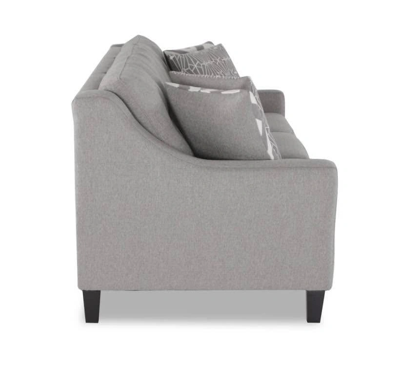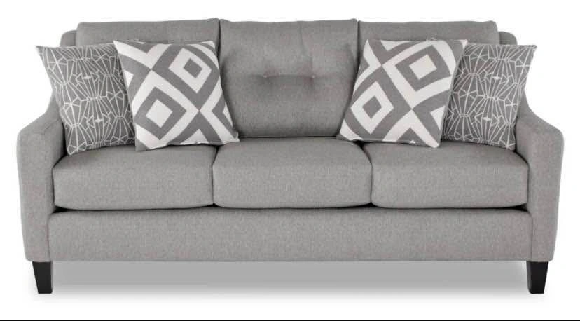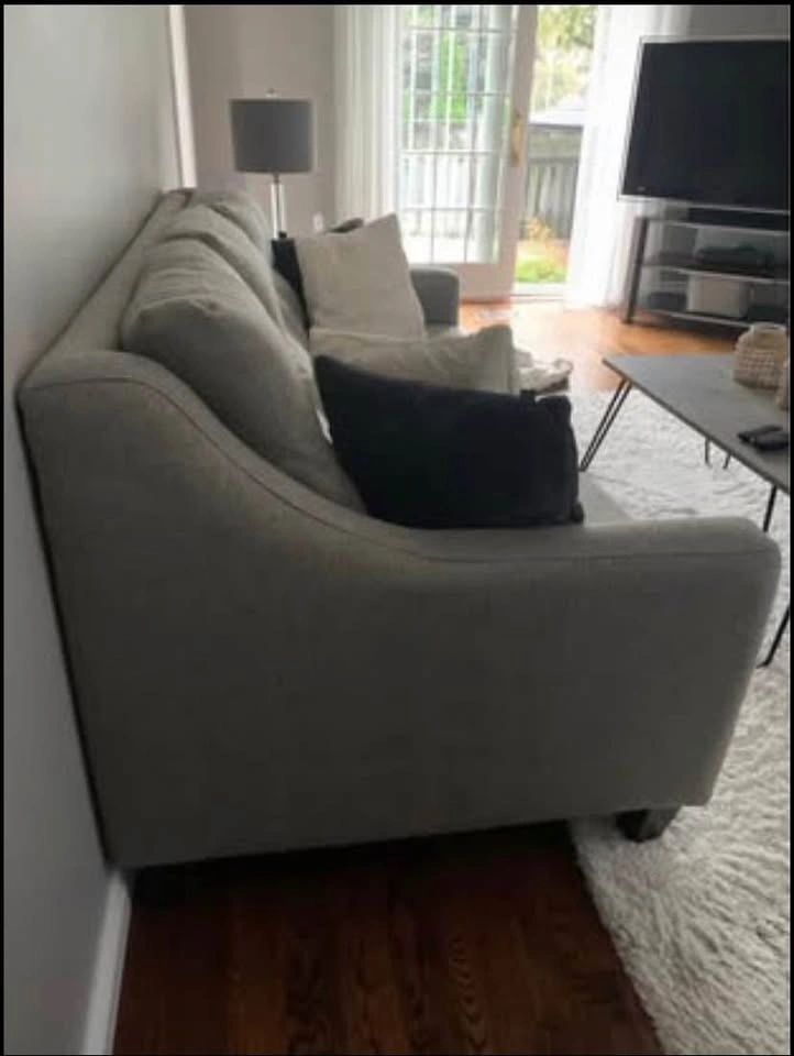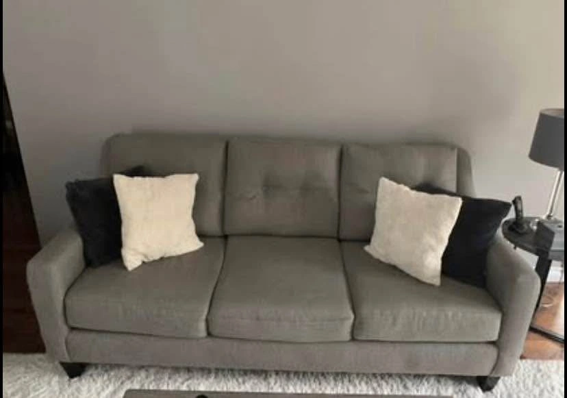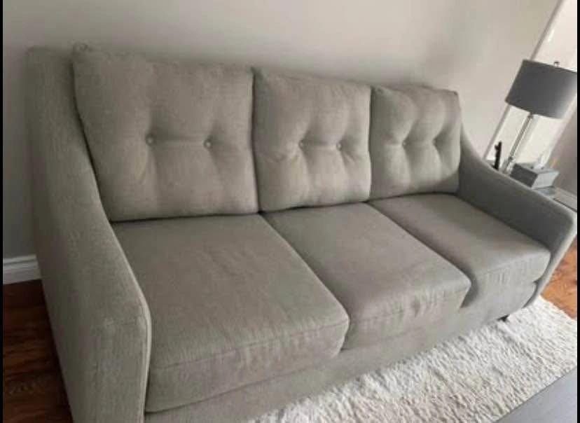 Kylie Cindy Crawford line 3 seat sofa in a grey linen look fabric. Button tufting on back cushions. Cushions are all zippered for easy removal/cleaning. Dimensions are 80 inches length 38 inches depth. Accent cushions not included. Cash on pickup in the Rathburn and Tomken area Mississauga.