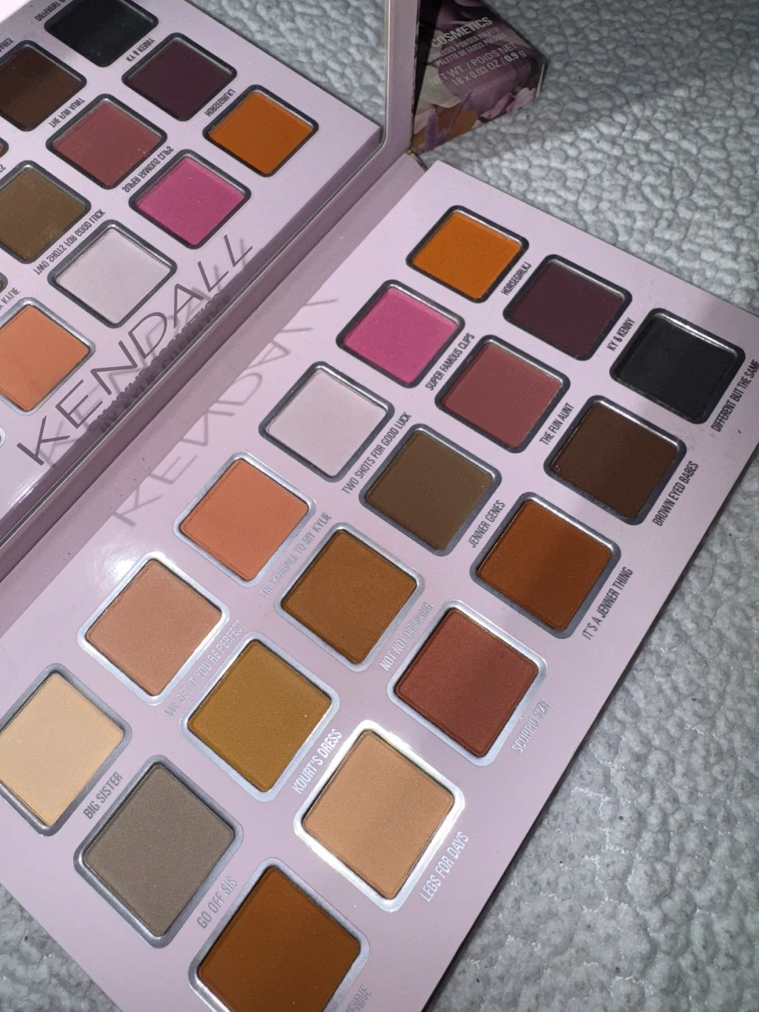 15Selling a Kylie Cosmetics Kendall Palette. The palette includes a variety of shades, including 'Big Sister', 'Go Off Sis', 'Equestrienne', 'Kourt's Dress', 'Less for Days', 'Scorpio Szn', 'Not Not Drinking', 'Jennifer Gems', 'It's a Jenner Thing', 'Brown Eyed Babes', 'Different But the Same', 'Ky & Kenny', 'Horse Girl Jj', 'Super Famous Clips', 'The Fun Aunt', 'Two Shots for Good Luck', 'The Kendall to My Kylie', and 'We Get It You're Perfect'.