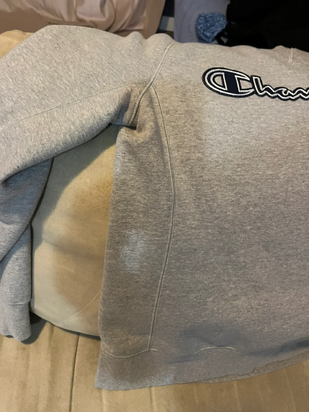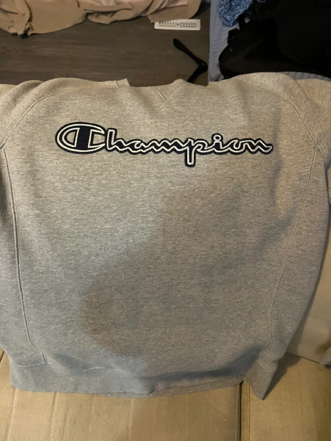 Champion authentic athletic apparel crewneck sweatshirt. Grey colour in size medium. Made in Cambodia. It has slimmers on the sides super warm and fuzzy inside