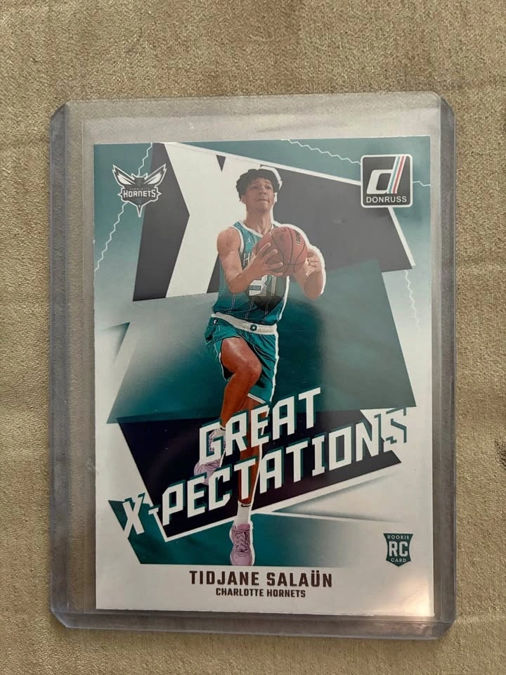 This is a 2024-25 Donruss "Great X-Pectations" rookie card of Tidjane Salaün, who plays for the Charlotte Hornets. It is a rookie (RC) card and features the Charlotte Hornets team logo. The card is part of the "Great X-Pectations" subset of the Donruss collection. The card shows Salaün in a teal and purple uniform, dribbling a basketball. Feel free to message if you have any questions!
