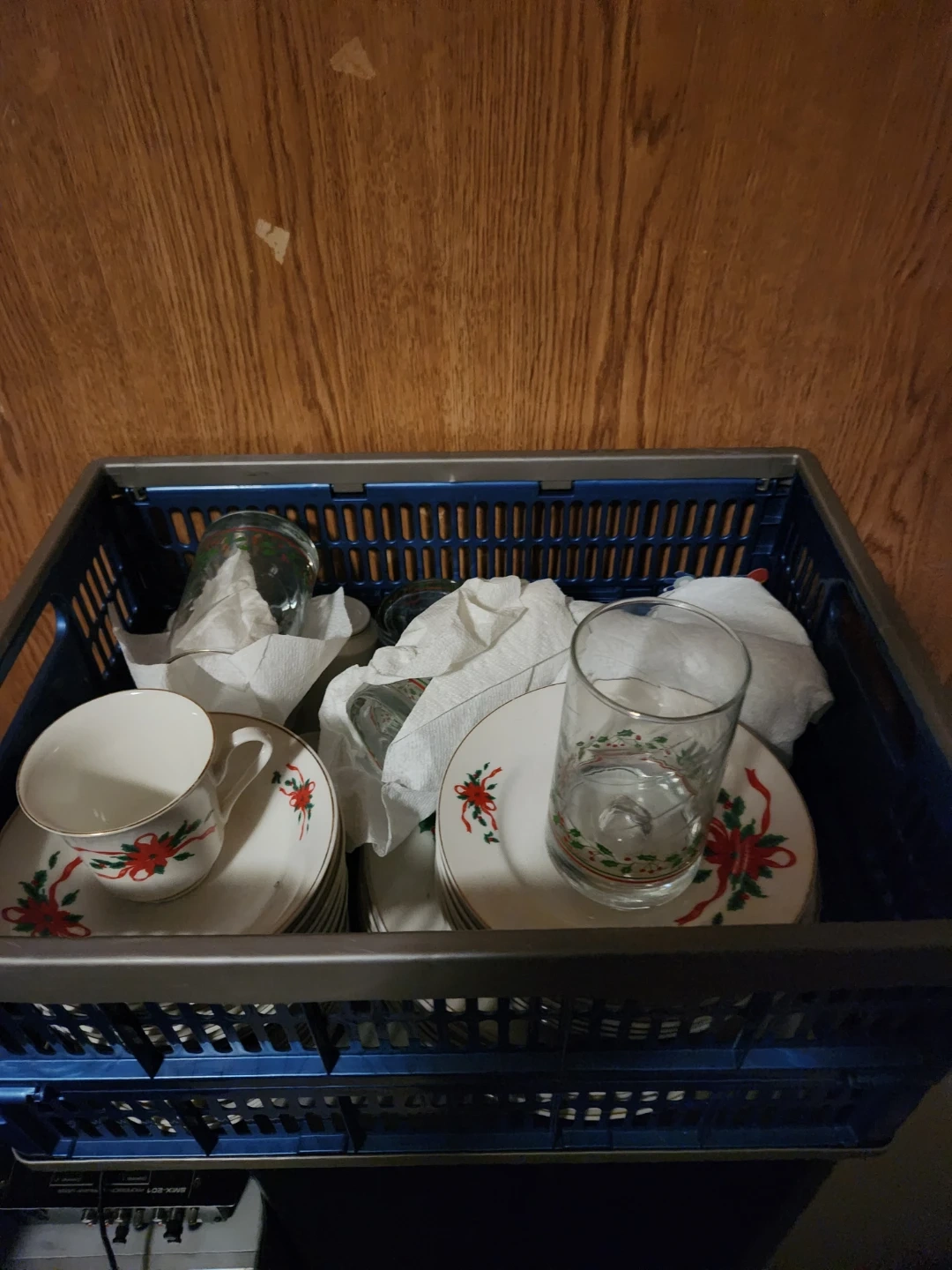 White ceramic dinnerware with a red poinsettia and bow design with gold trim. Includes cups, saucers, and plates. Also includes tumblers with a matching holiday pattern. Great for festive gatherings!