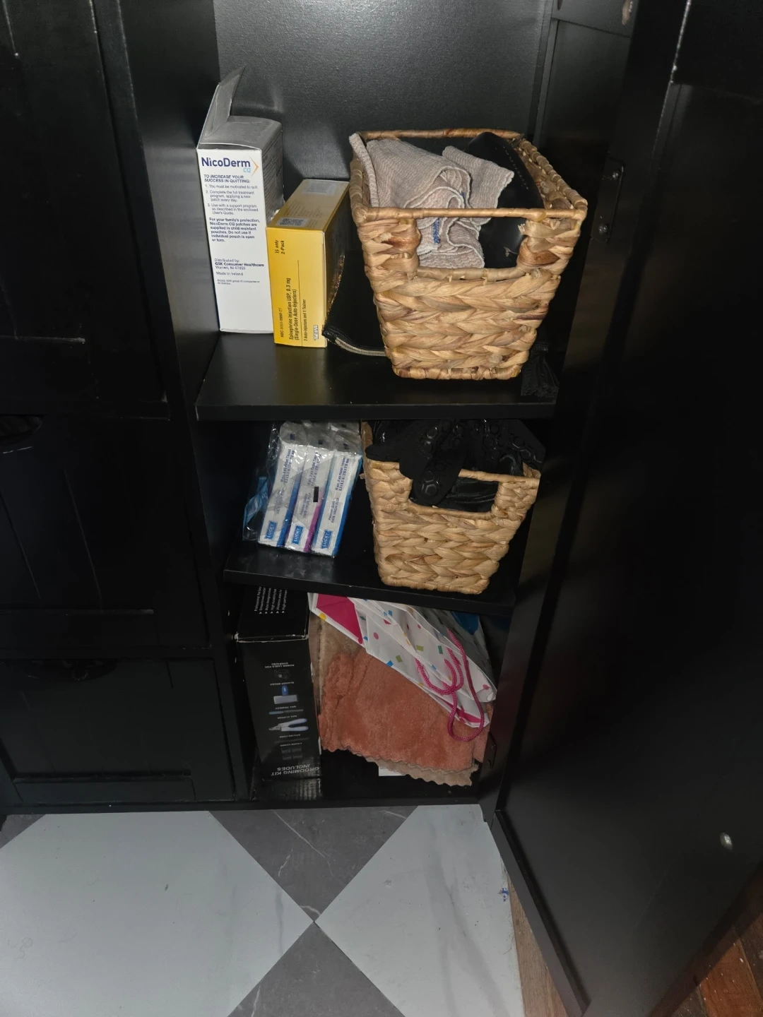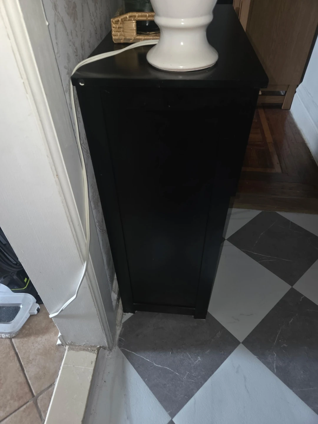 This dark brown storage cabinet offers versatile storage options. It features three drawers on the left and a single door on the right. Its slatted design adds a touch of style to any room.