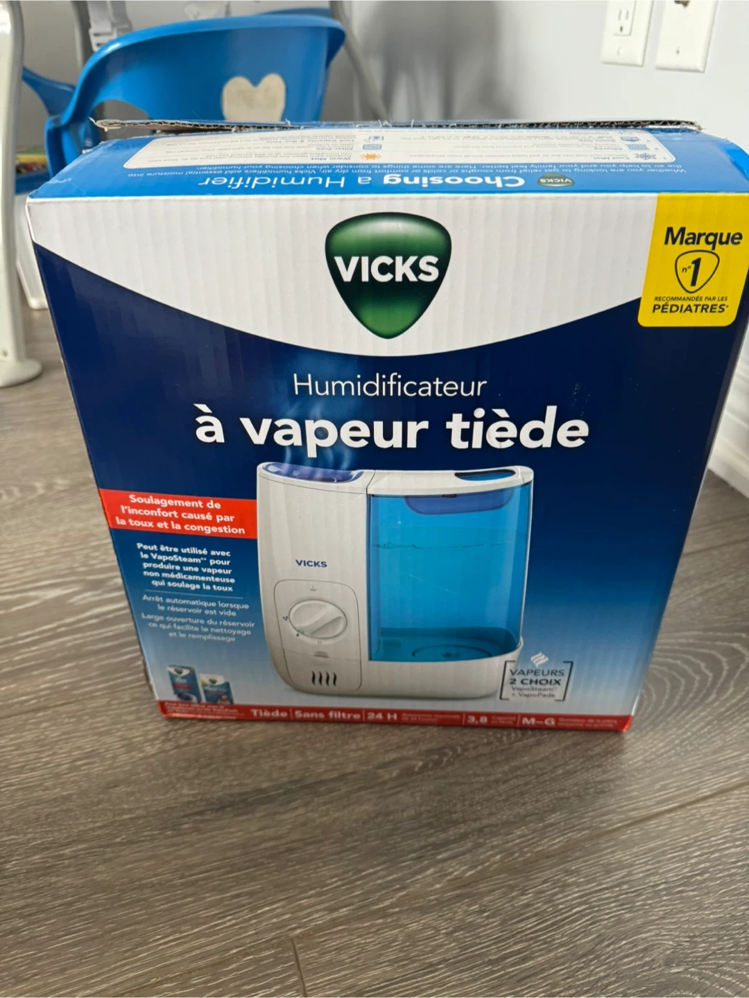 Vicks warm mist humidifier in white and blue. Comes with original packaging. Designed to provide soothing steam for coughs and congestion.