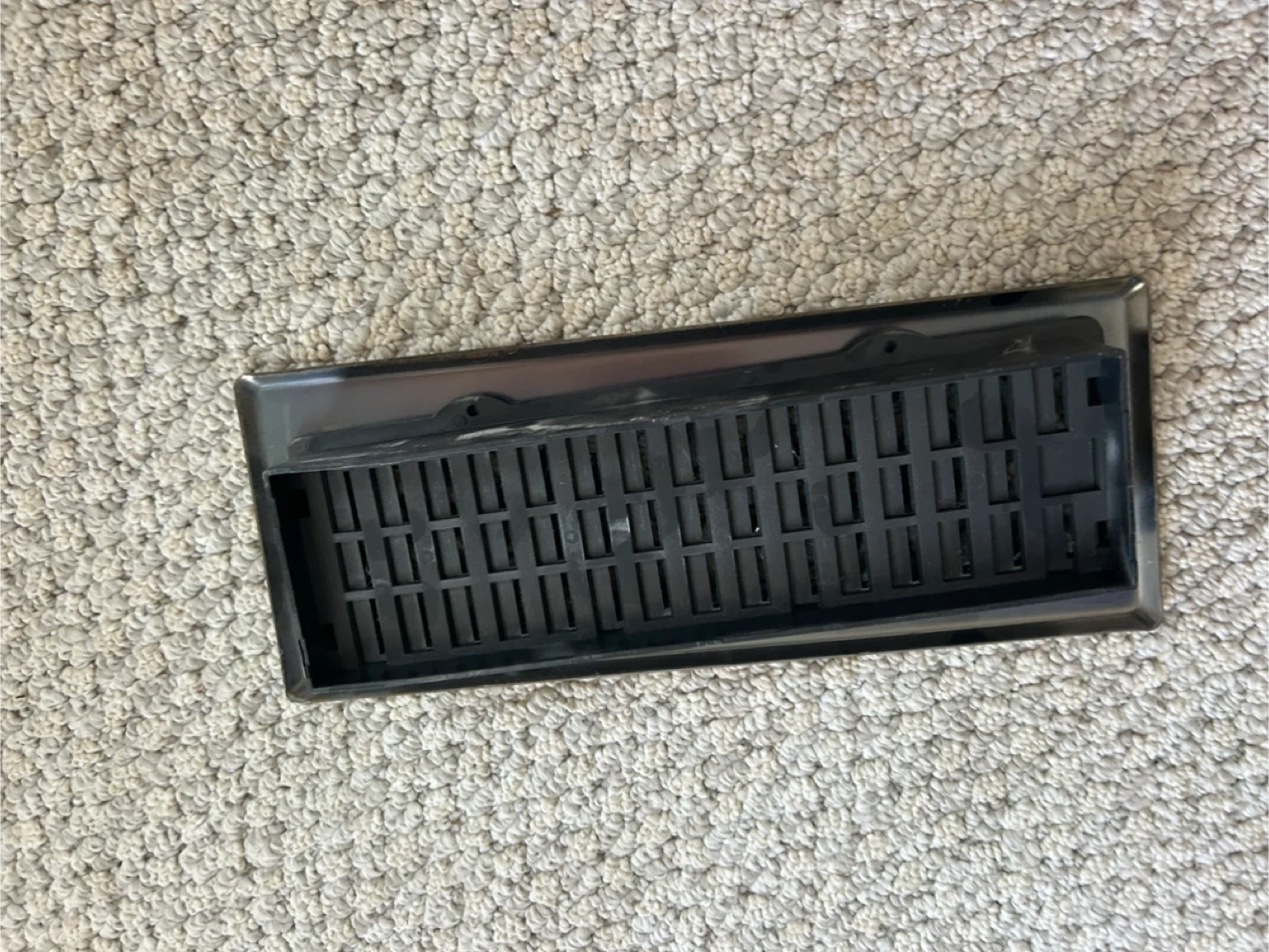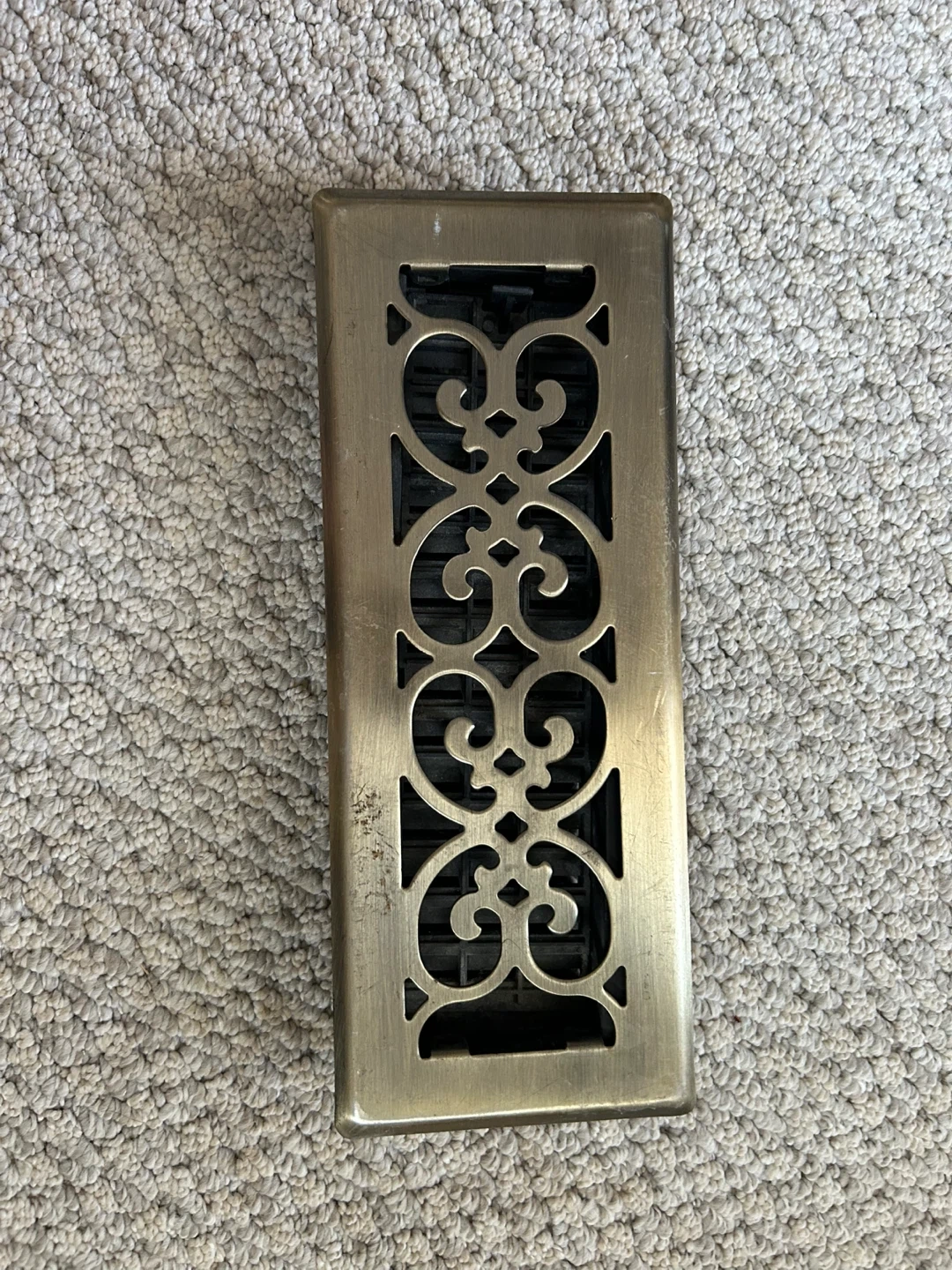A vintage decorative metal grille with an ornate pattern. It's a classic piece that adds a touch of old-world charm to any space. This grille measures approximately 8 inches long by 3 inches wide.