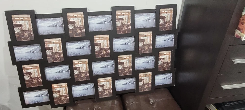 This is a black collage photo frame. It holds multiple pictures in a mosaic design. It's a nice way to display several memories at once!