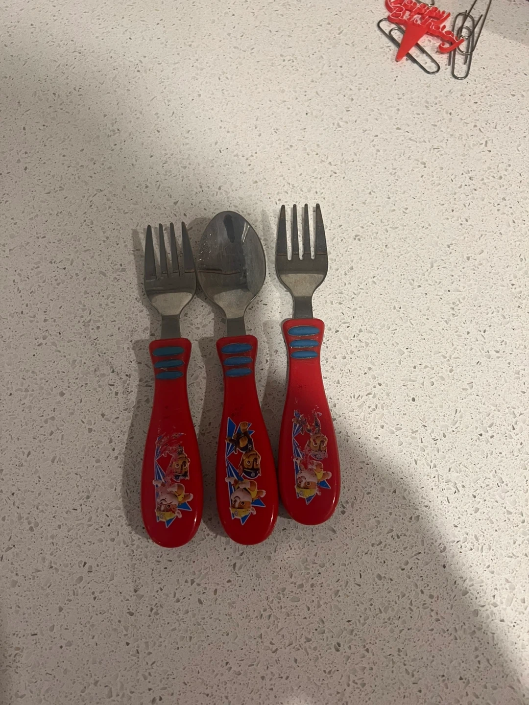 Set of toddler cutlery featuring Paw Patrol characters. Includes one spoon and two forks. Bright red handles with character graphics. Metal utensil heads.