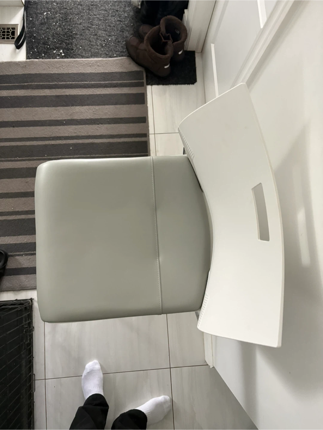 Selling a bar stool with a white back and grey seat. It has a sleek, modern design and would look great in any kitchen or bar area. The seat is padded for extra comfort!