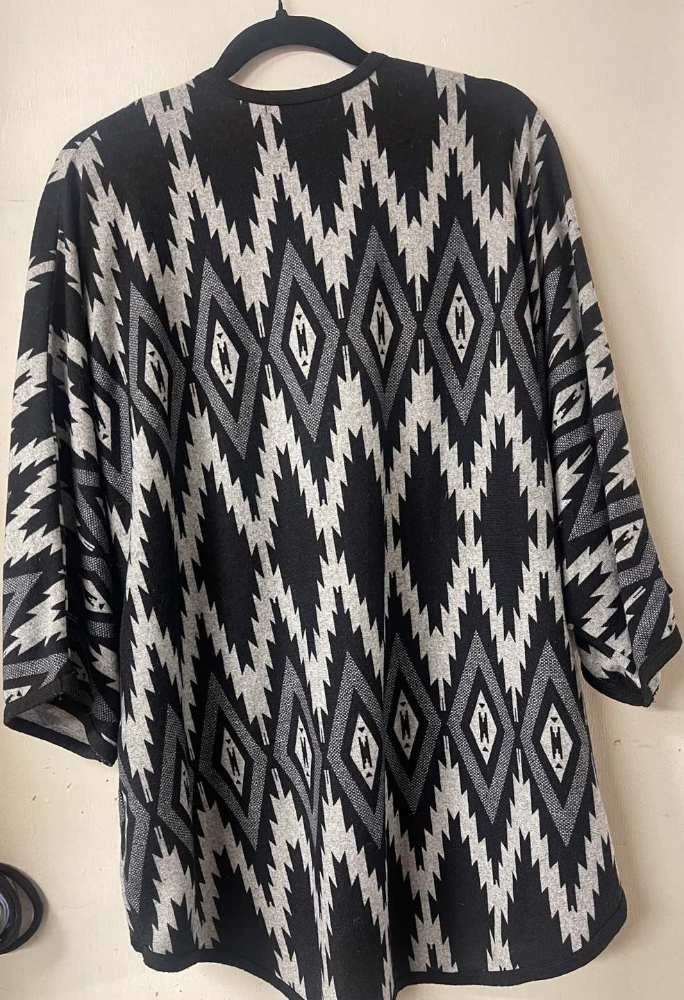 This cardigan features a black and grey geometric pattern. The material is a soft knit fabric. 3/4 length sleeve.