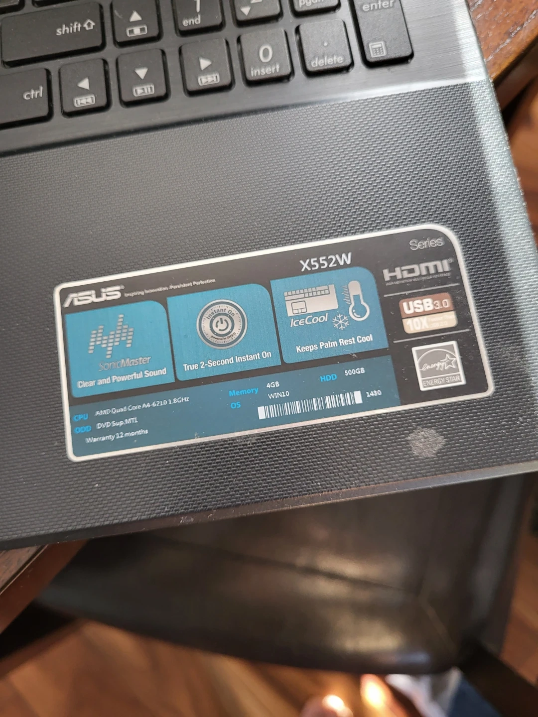 ASUS X552W laptop with SonicMaster sound. It's powered by an AMD Quad Core A4-6210 1.8GHz CPU and has 4GB of RAM. Stopped powering on great for parts!