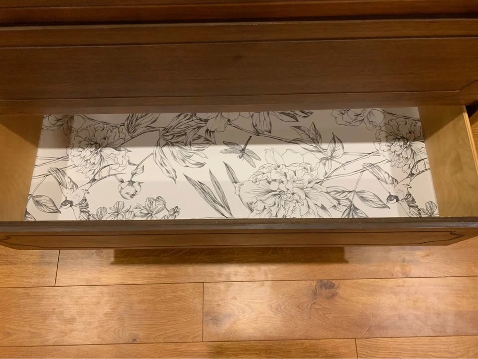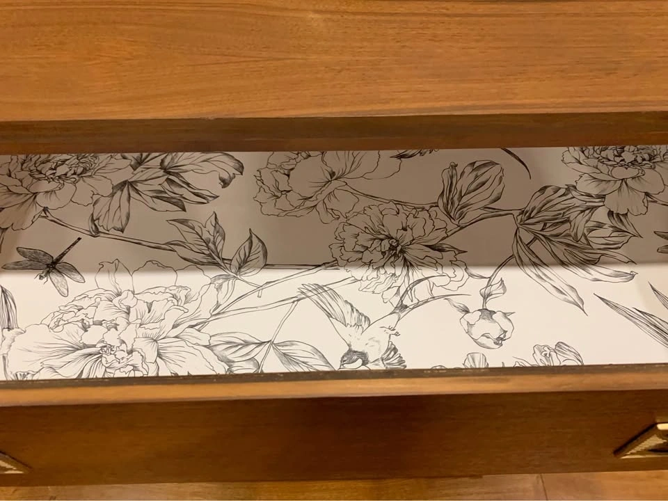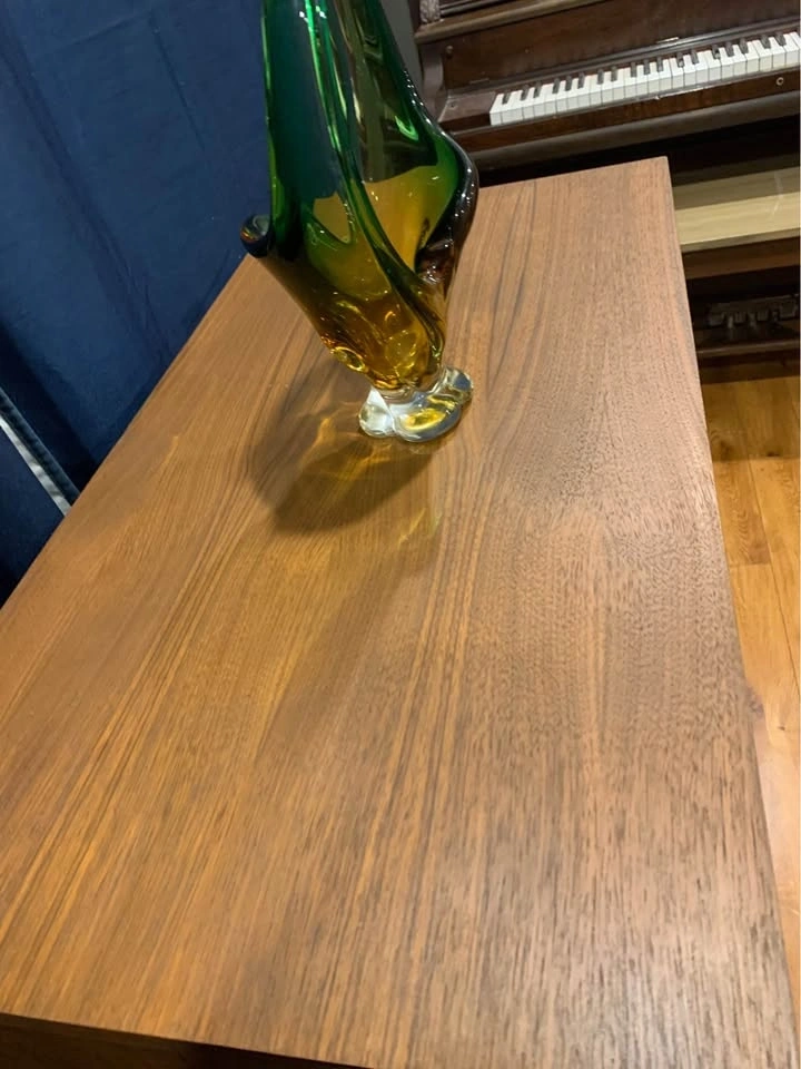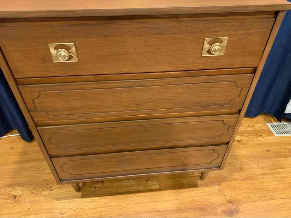 Refinished vintage mid-century modern (MCM) walnut dresser with four drawers. Top drawer has vintage sculptural solid brass pulls, and the last three drawers open from the bottom. All drawers have been freshly lined. Features iconic MCM design characteristics like tapered legs and clean lines. Crafted from solid wood with walnut veneer. Top coated for protection and ready for a new home.