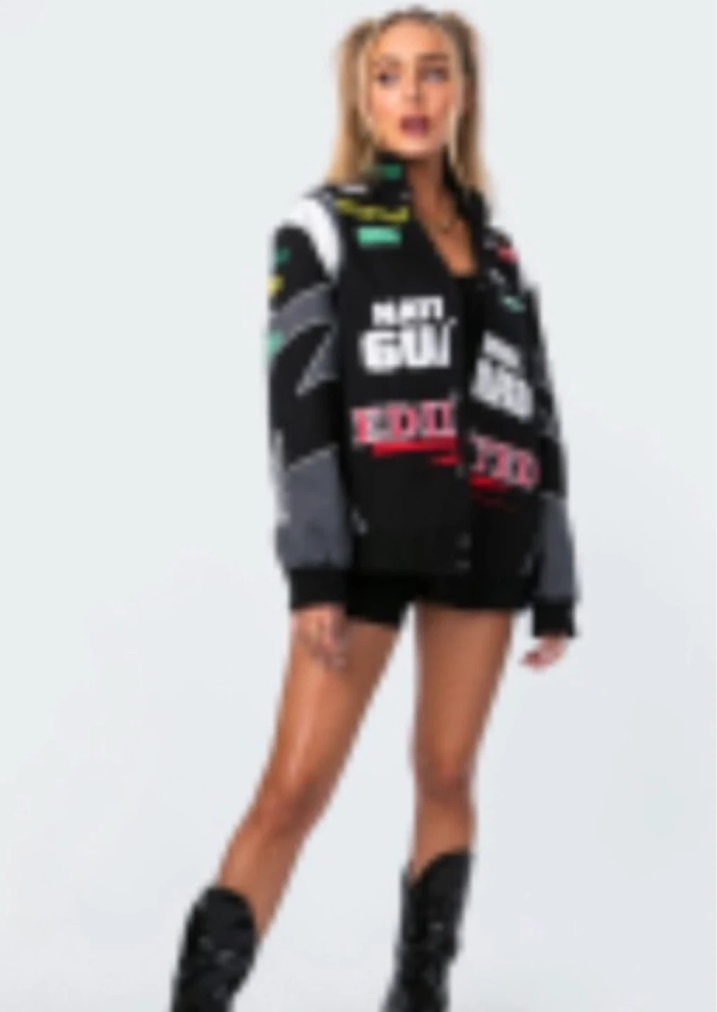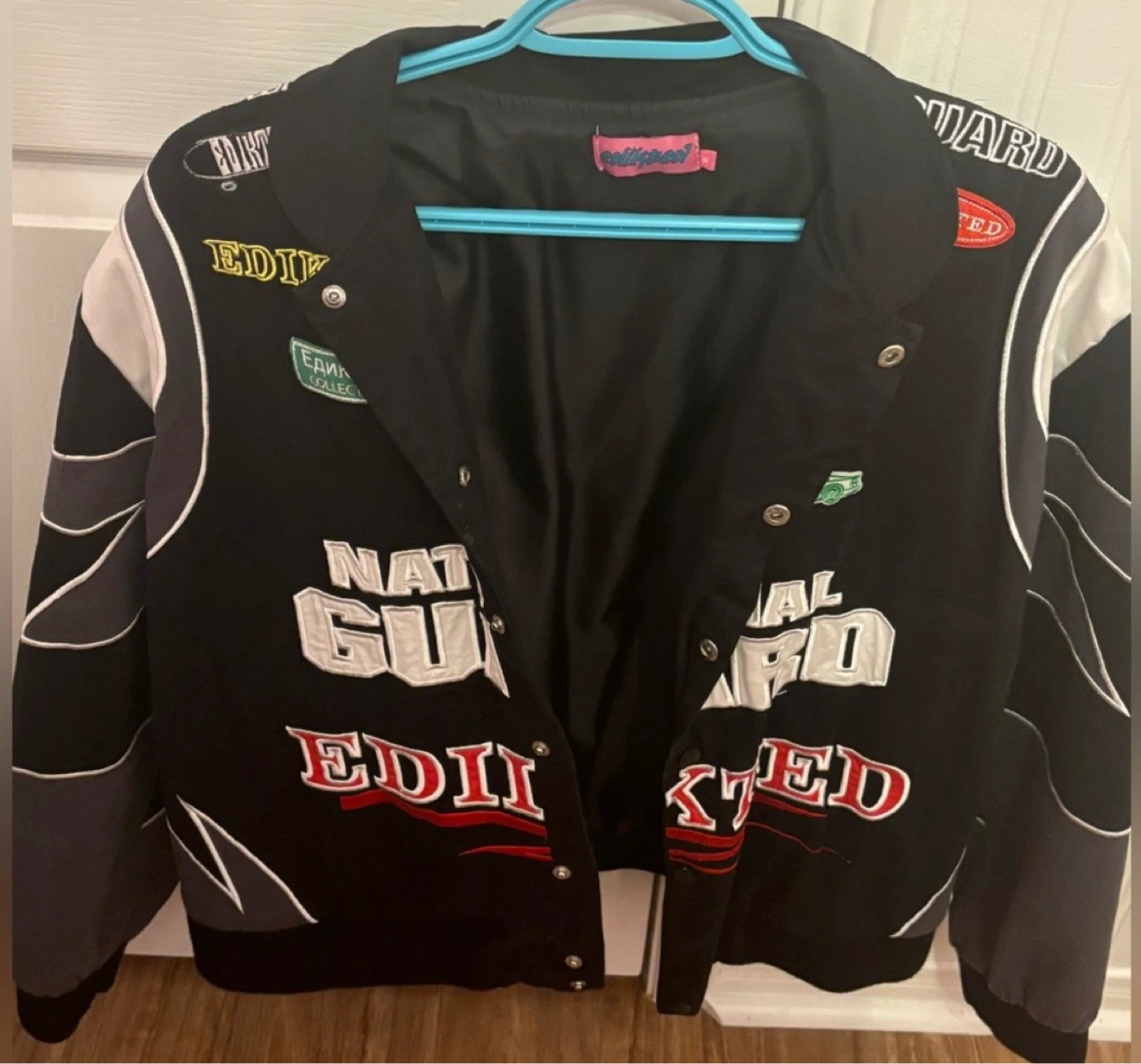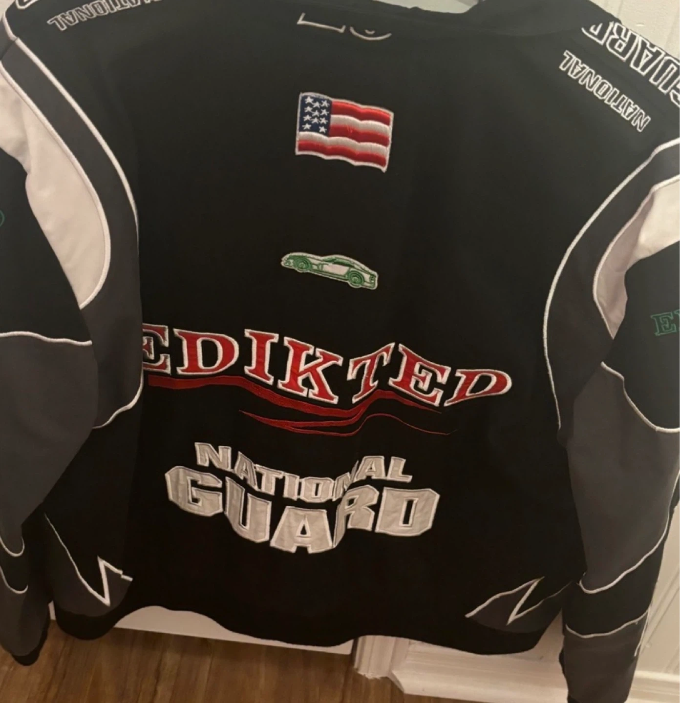 Black bomber jacket with "EDITED NATIONAL GUARD" graphics on the front and back. Features an American flag patch and a small car graphic. It's a stylish outerwear piece. Snap button closure.