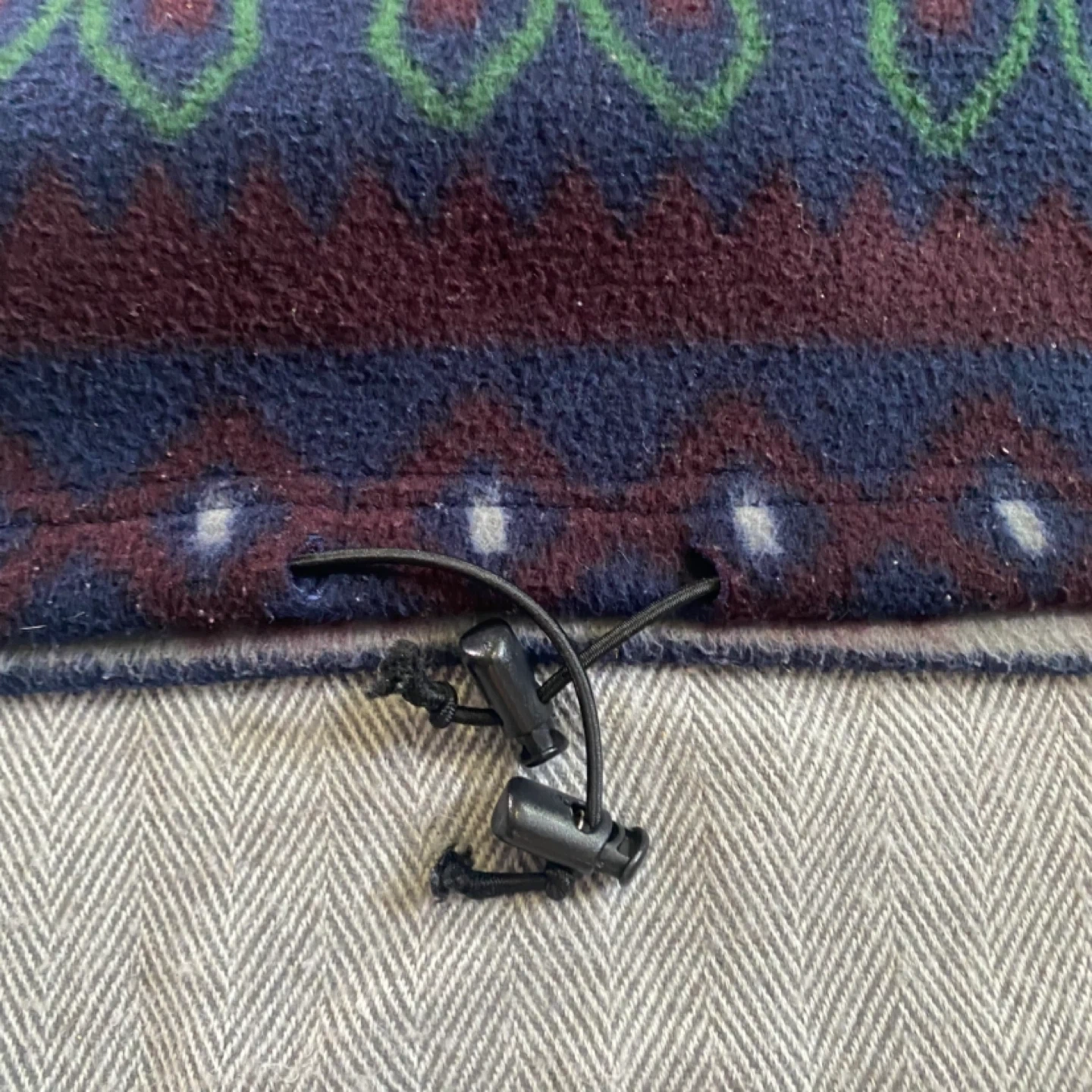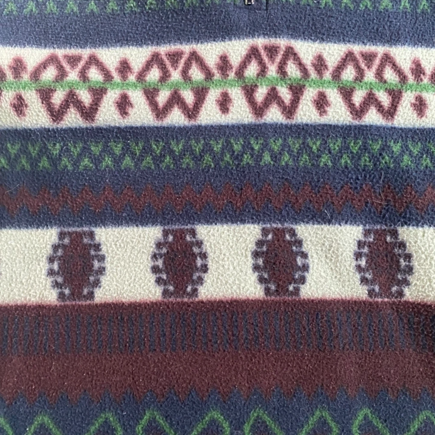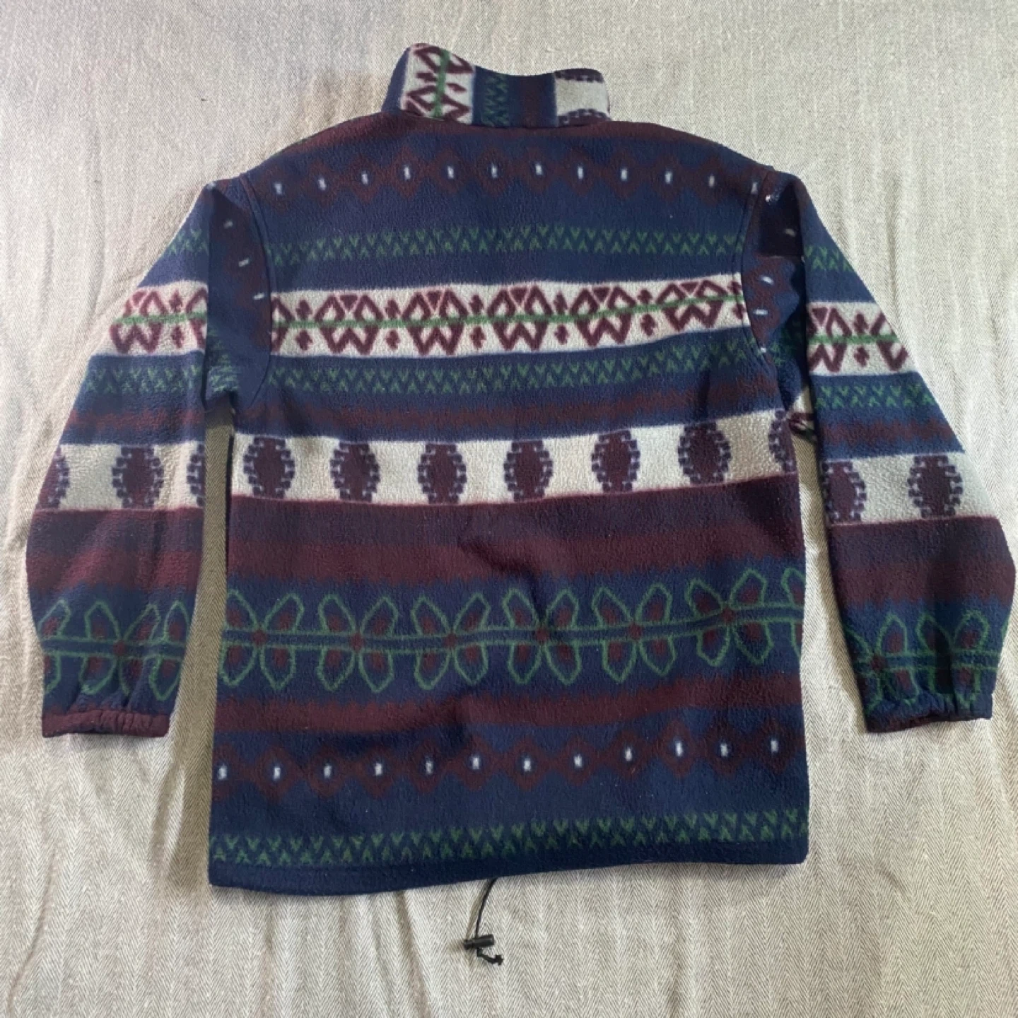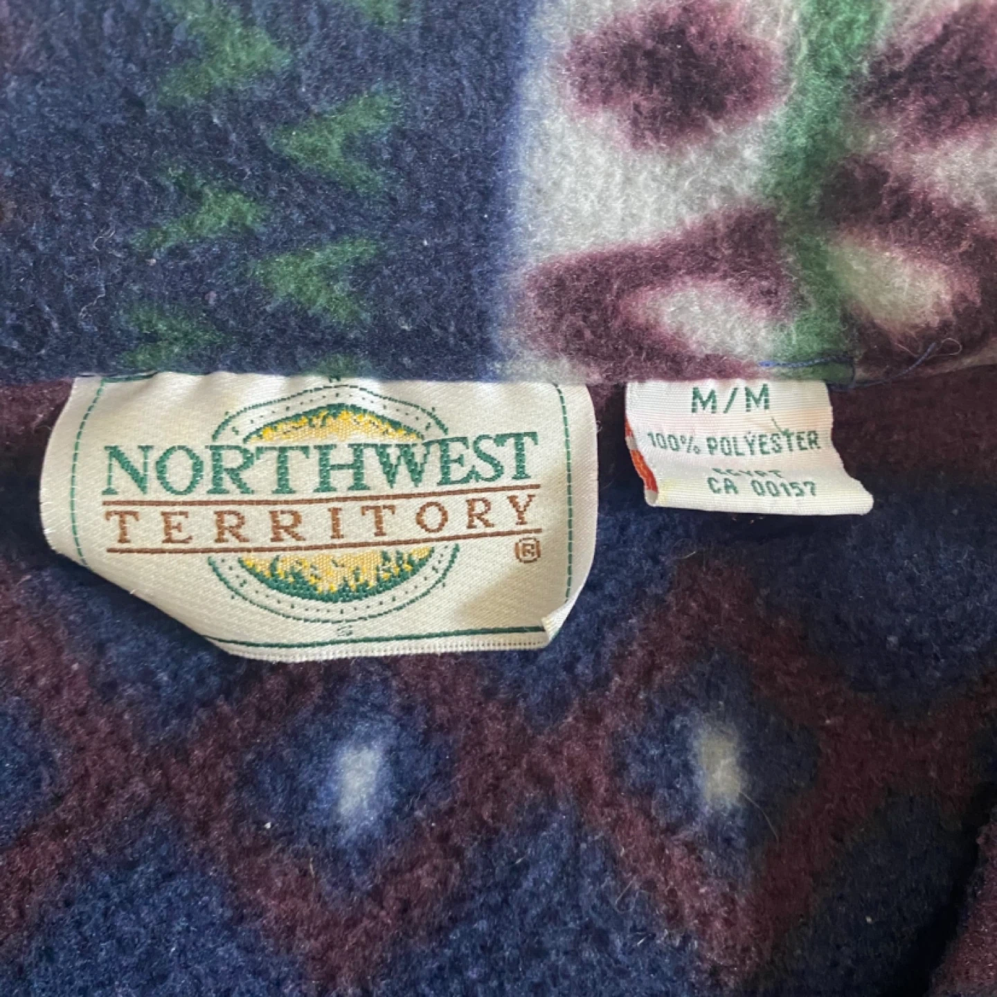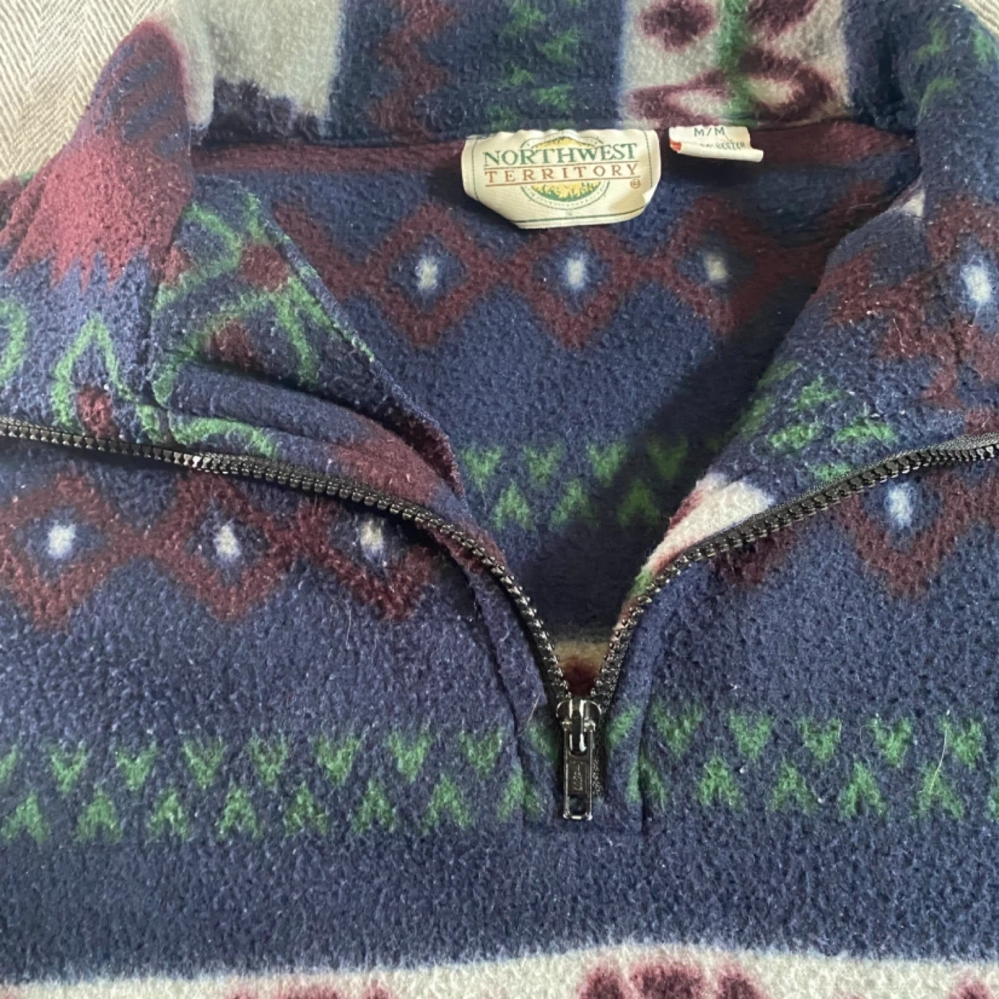 Cozy Northwest Territory pullover sweater with a bold geometric pattern. It's made of 100% polyester for warmth. Size is M/M.