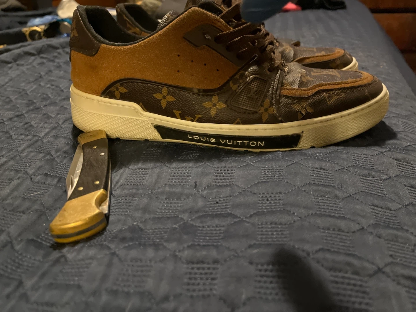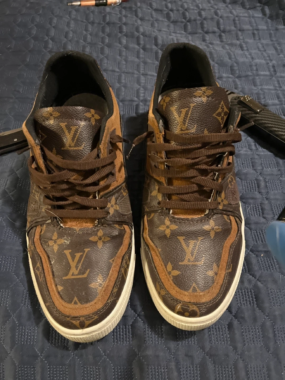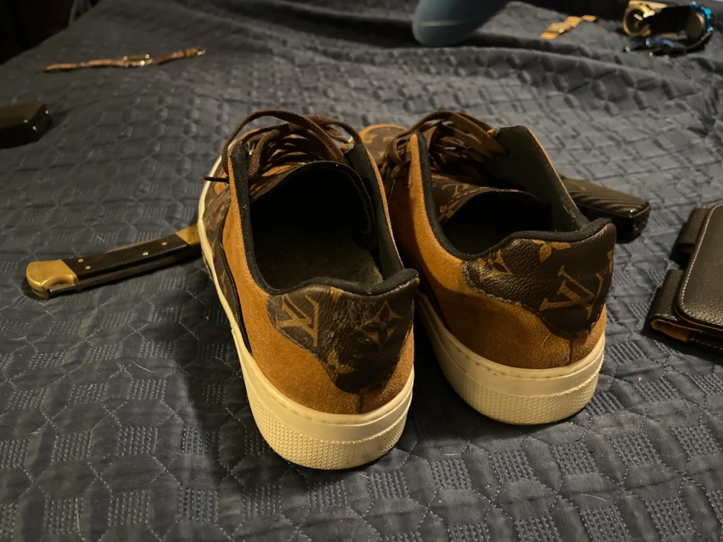 These are Louis Vuitton monogram low-top sneakers. They feature a brown and tan colourway with the signature LV pattern. Brown laces and a white sole complete the look.