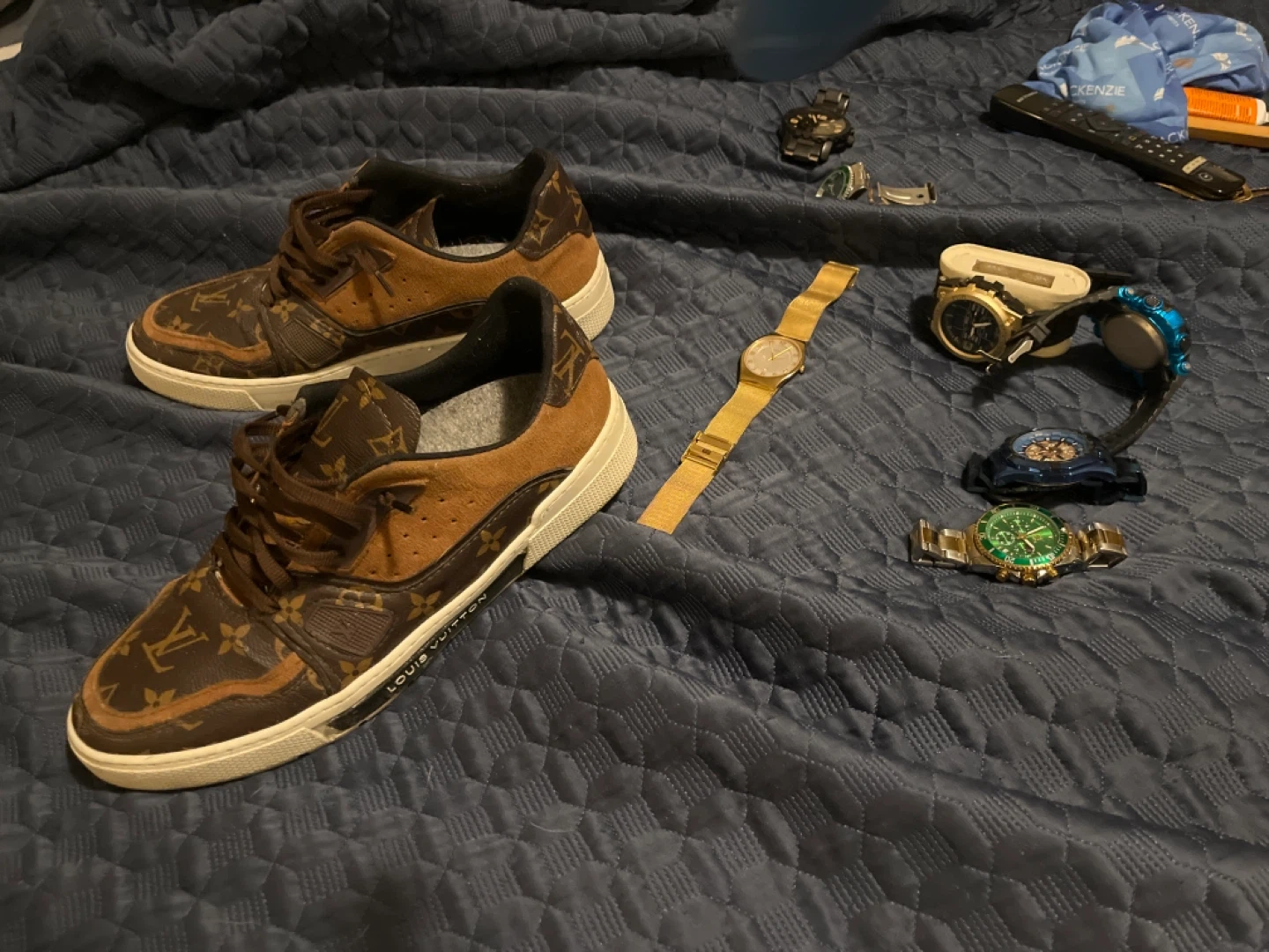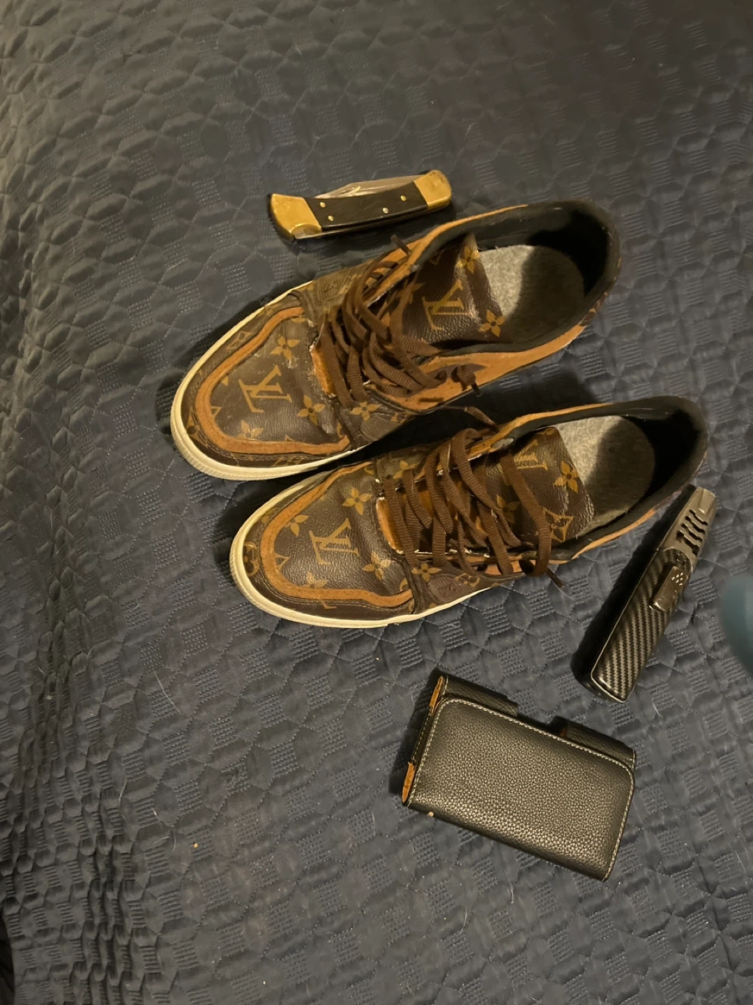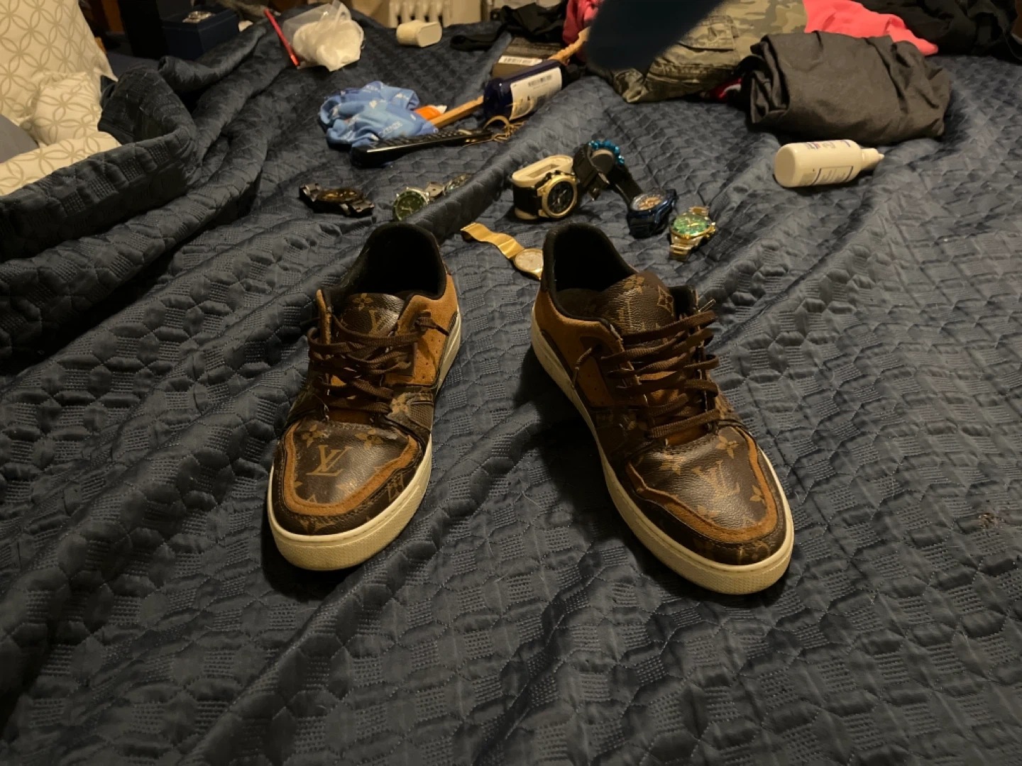 These are Louis Vuitton monogram low-top sneakers. They feature a brown and tan colourway with the signature LV pattern. Brown laces and a white sole complete the look.
