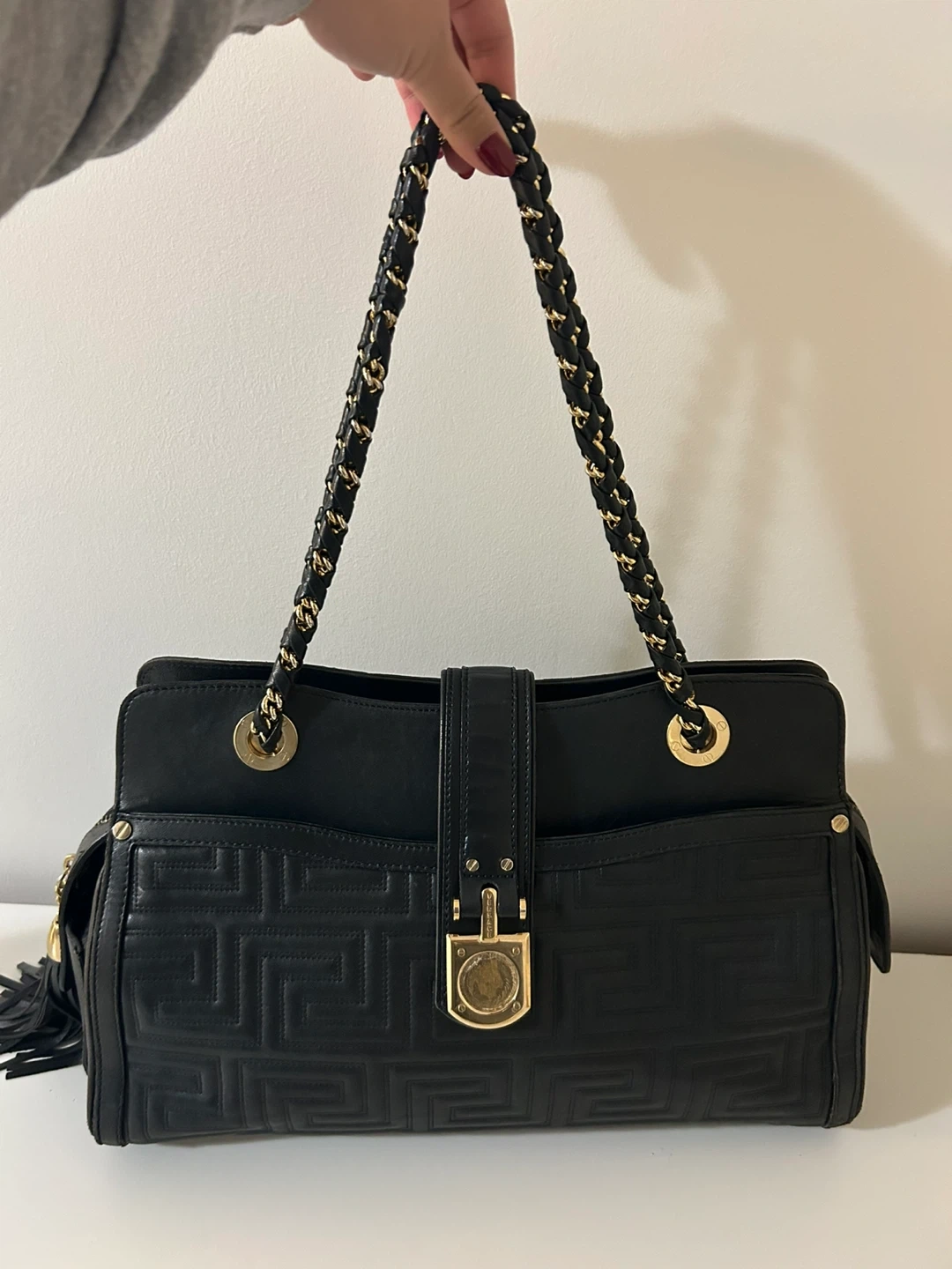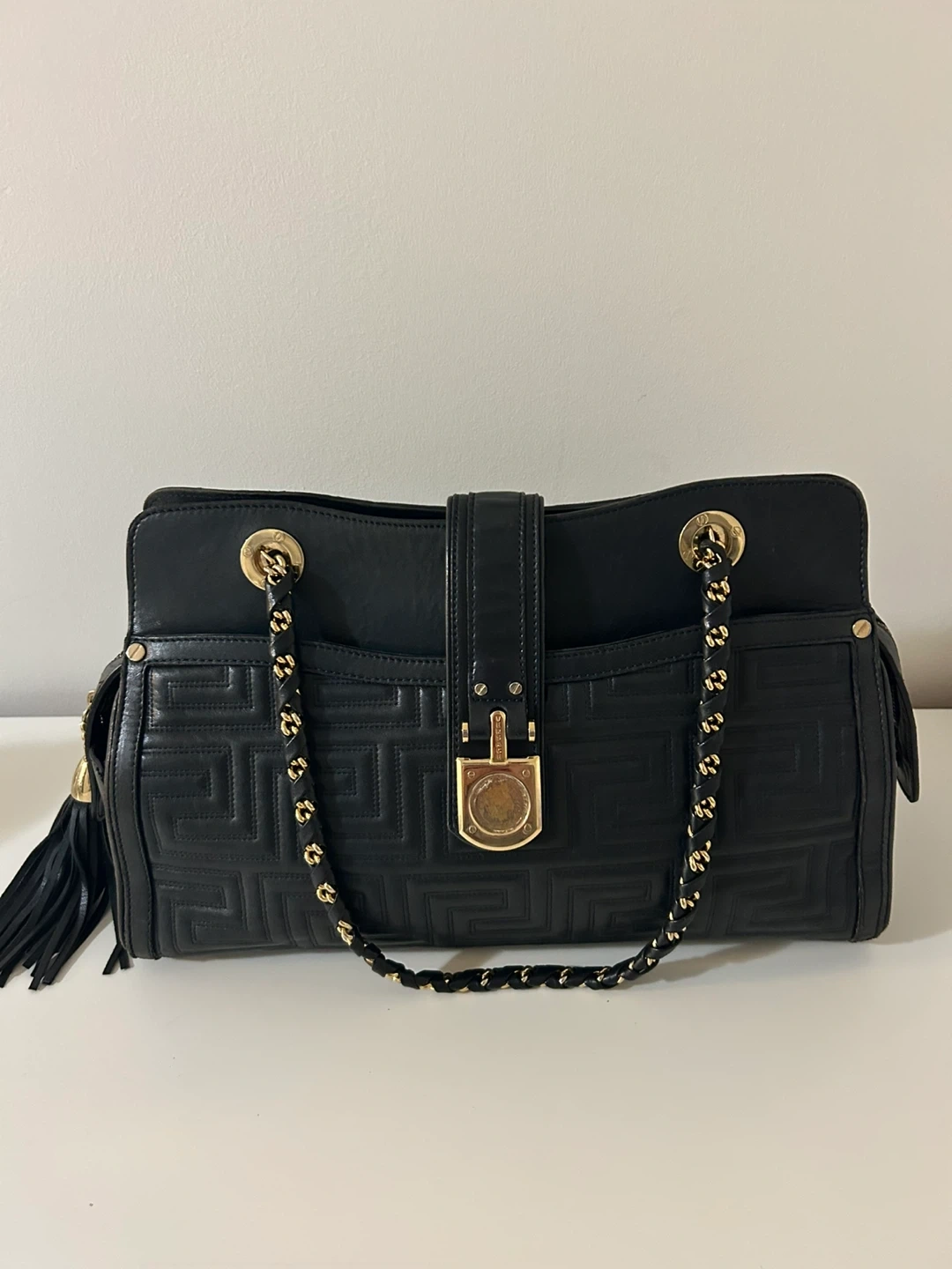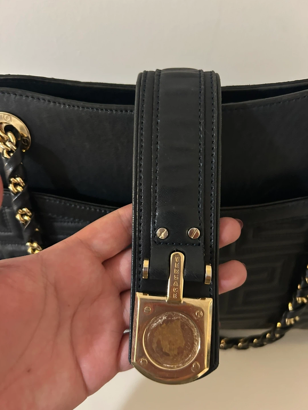 Black leather Versace shoulder bag with gold chain accents and a prominent Medusa head clasp. It features quilted detailing and a stylish tassel accent. This bag is spacious and chic for everyday use. The Medusa in the the middle came off .