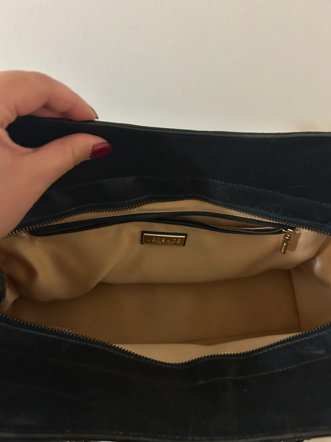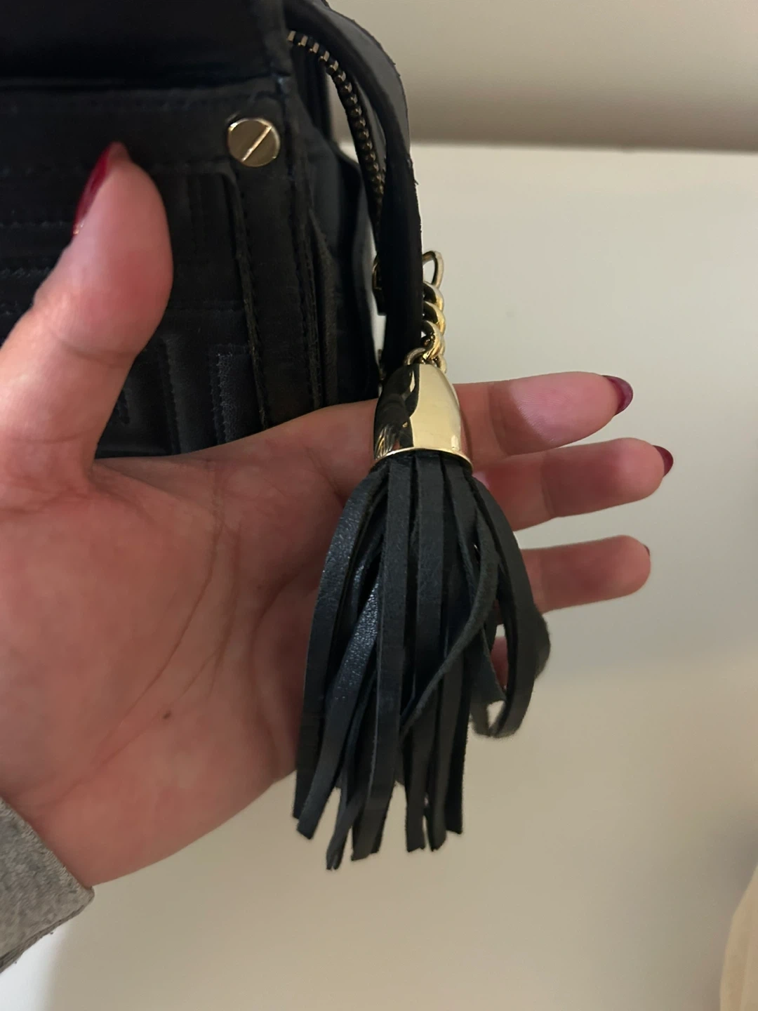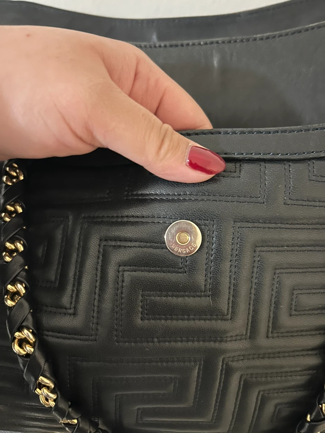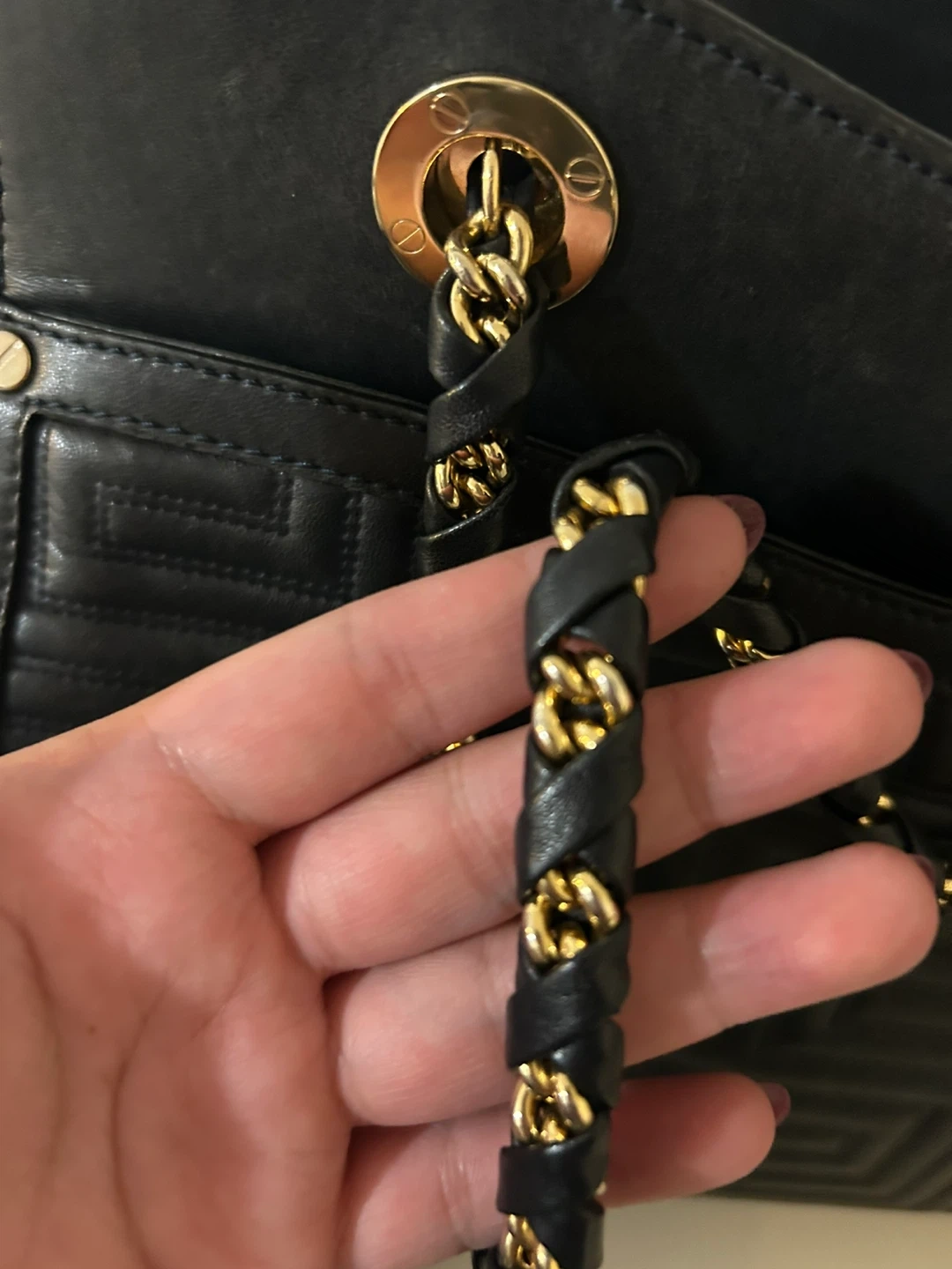 Black leather Versace shoulder bag with gold chain accents and a prominent Medusa head clasp. It features quilted detailing and a stylish tassel accent. This bag is spacious and chic for everyday use. The Medusa in the the middle came off .