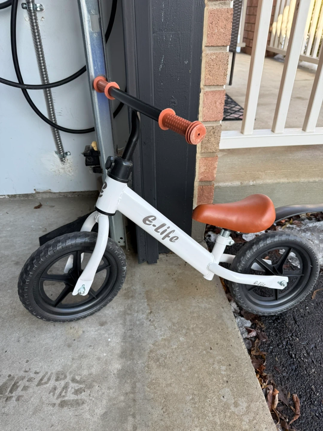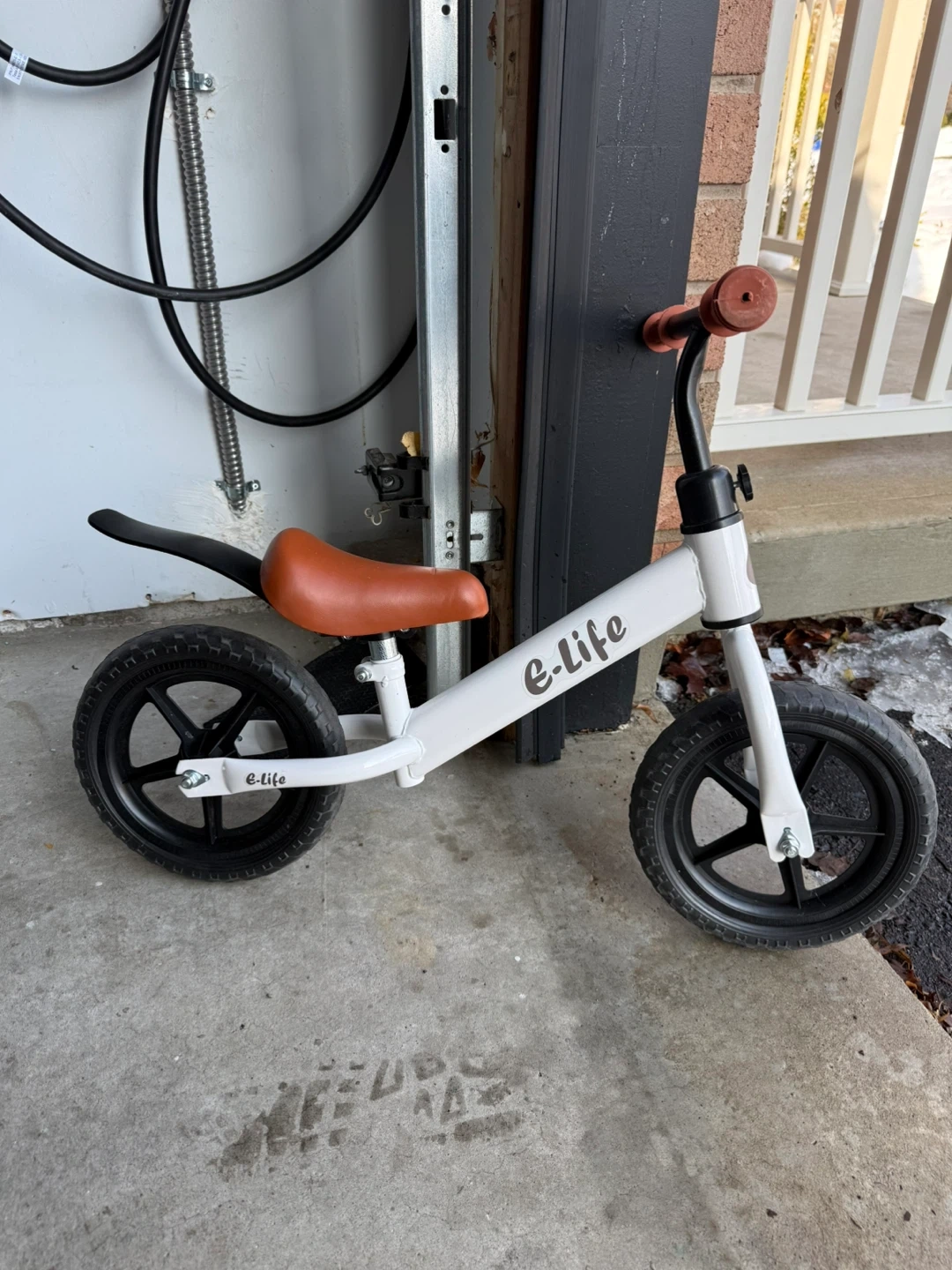 This E-life balance bike is white with brown grips and seat. It's a great way for little ones to learn balance and coordination. Perfect for outdoor fun!