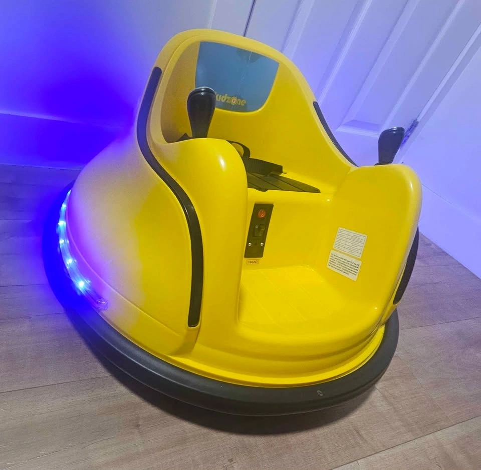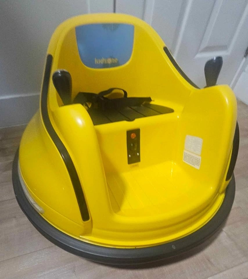 Awesome Kidzone electric bumper car in bright yellow. It has working lights around the base and a Bluetooth mode so you can easily hook up your phone and play music. Comes with a seatbelt for safety and a charger. My son hasn't shown much interest in riding it, and we don't have the space to keep it if it's not being used. Feel free to message if you have any questions! Cash Only.