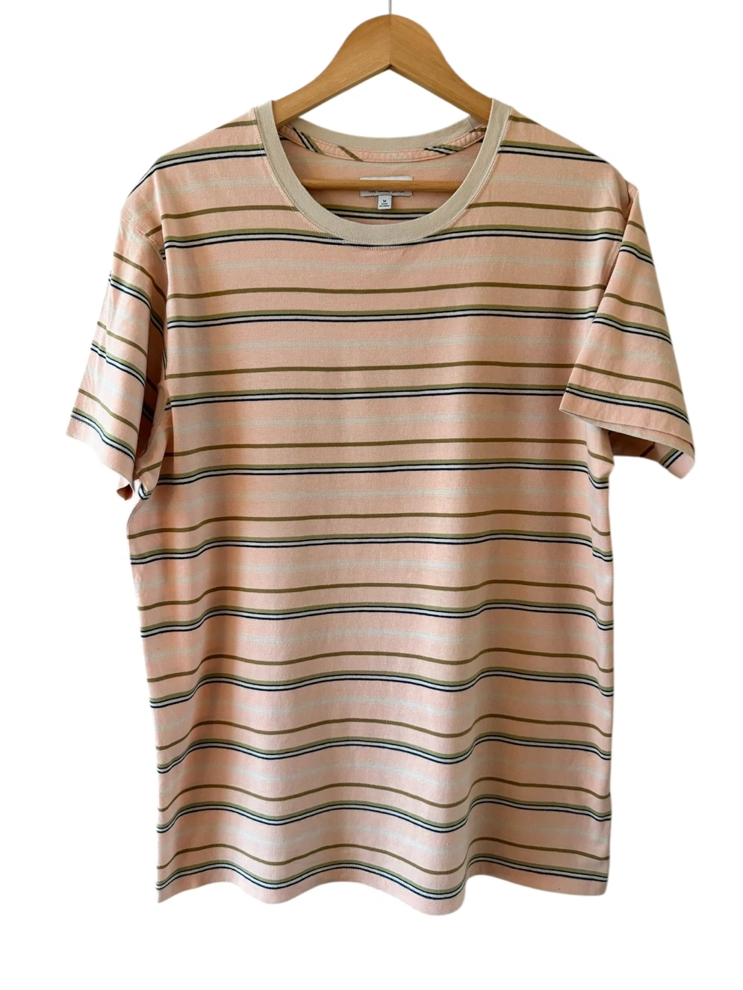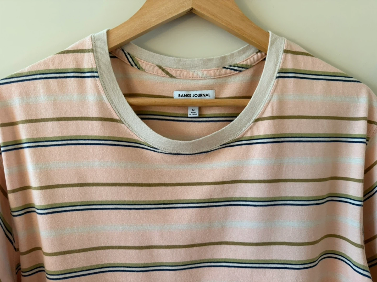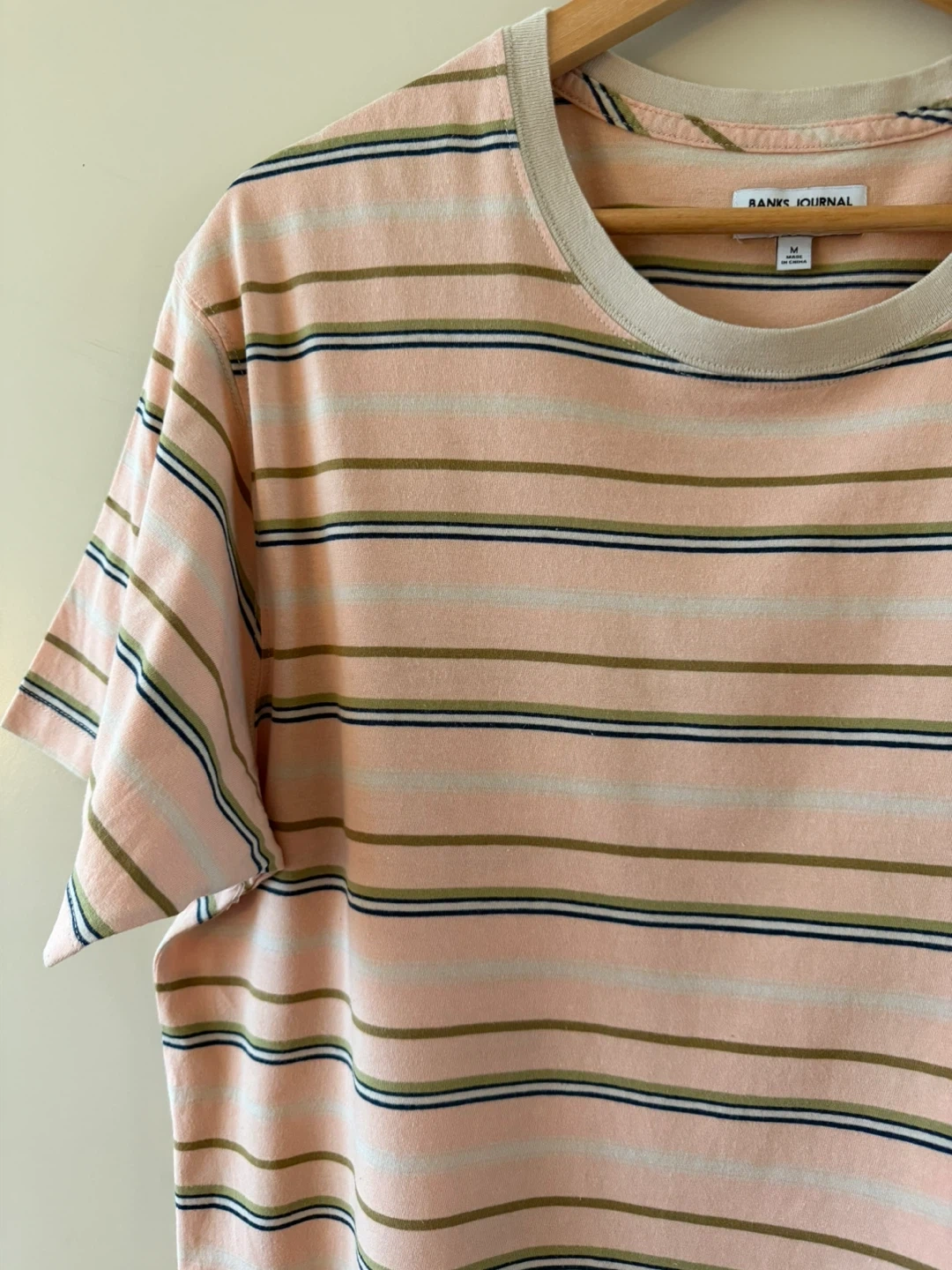 Banks Journal t-shirt in a size medium. Made from 100% organic cotton. Features a pastel stripe pattern with tan, olive, and navy accents on a light pink base. Crew neck and short sleeves. It's a comfortable everyday tee.