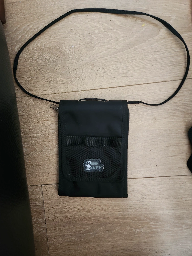 Miss Sixty, Black zippered pouch with a strap. Multiple pockets inside.