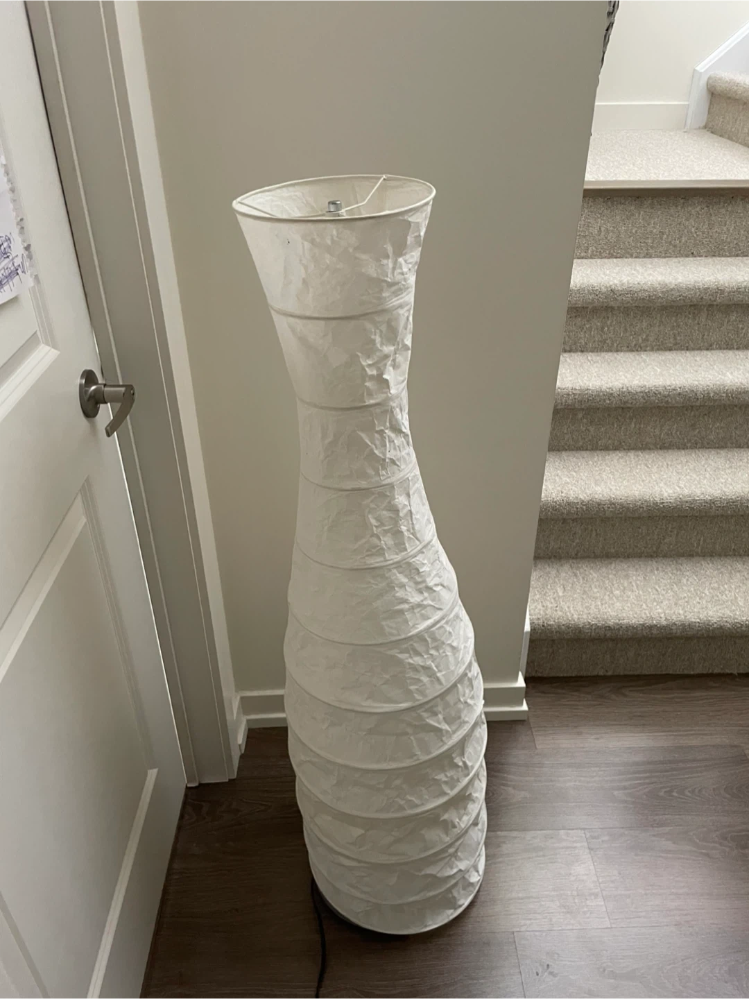 This is a tall, white floor lamp with a unique textured paper shade. It's designed to provide ambient lighting. The shade has a tapered, sculptural shape with horizontal segments.