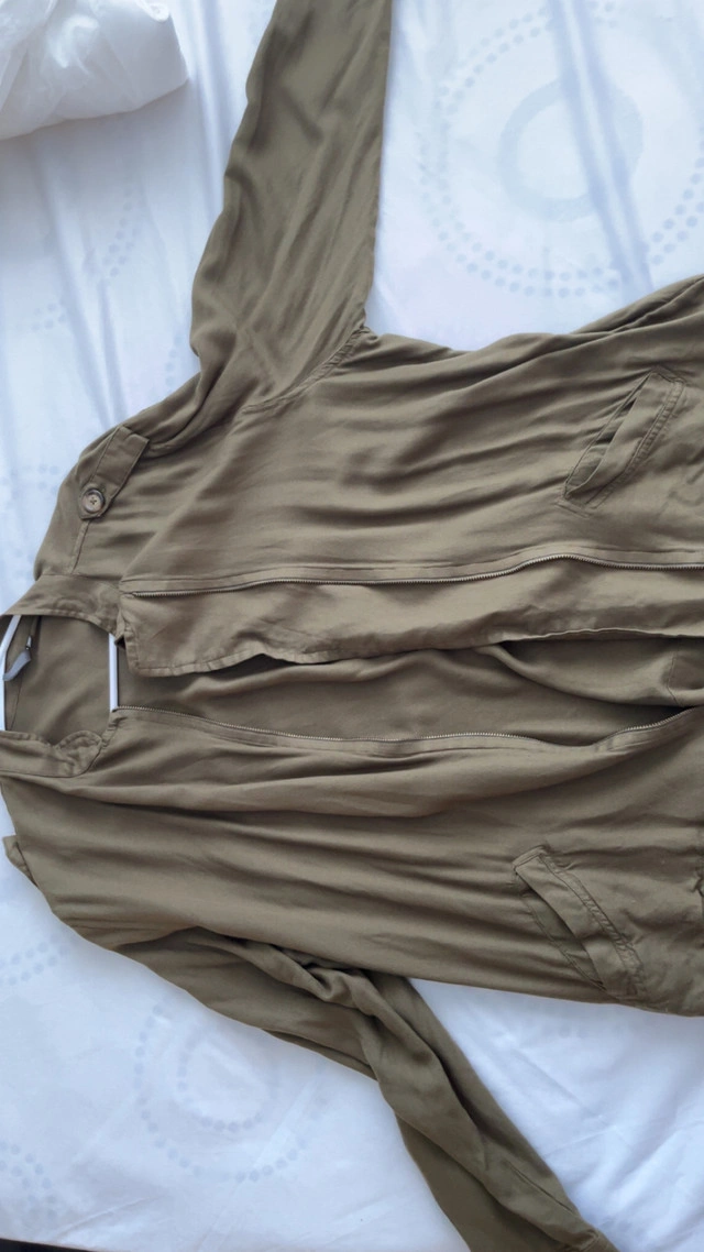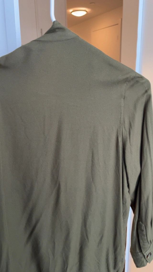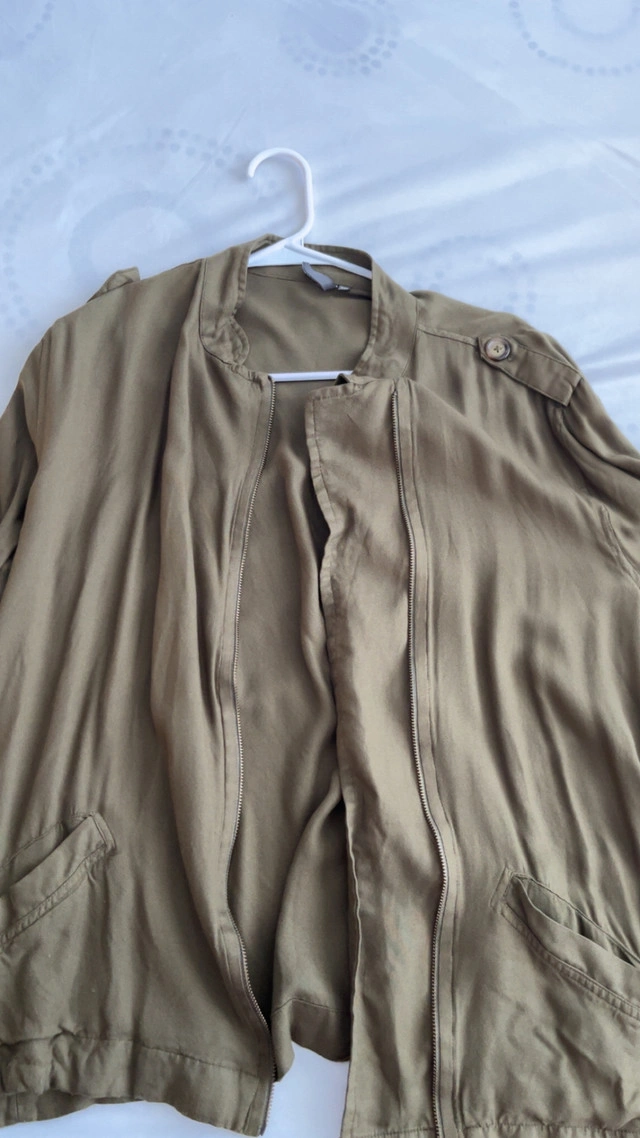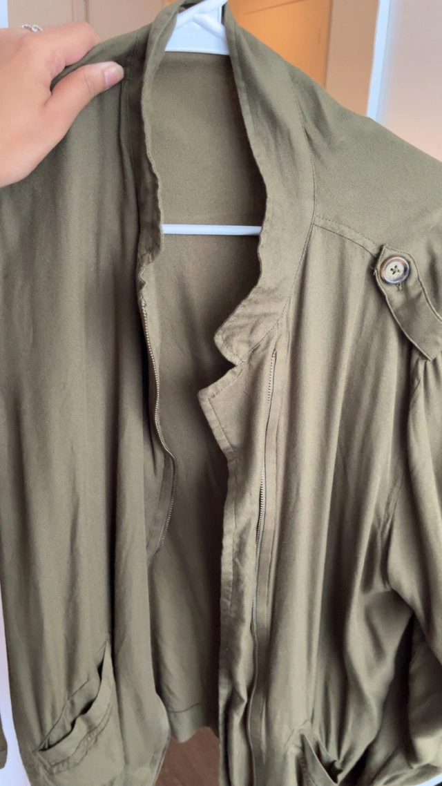 18Lightweight, oversized L.O.V jacket in an army green shade. Zip front with shoulder button detail. Two front pockets. Soft, flowy fabric — great for layering. Perfect for spring or fall. It’s oversized, size is between XL-XXL. Good condition, barely worn.