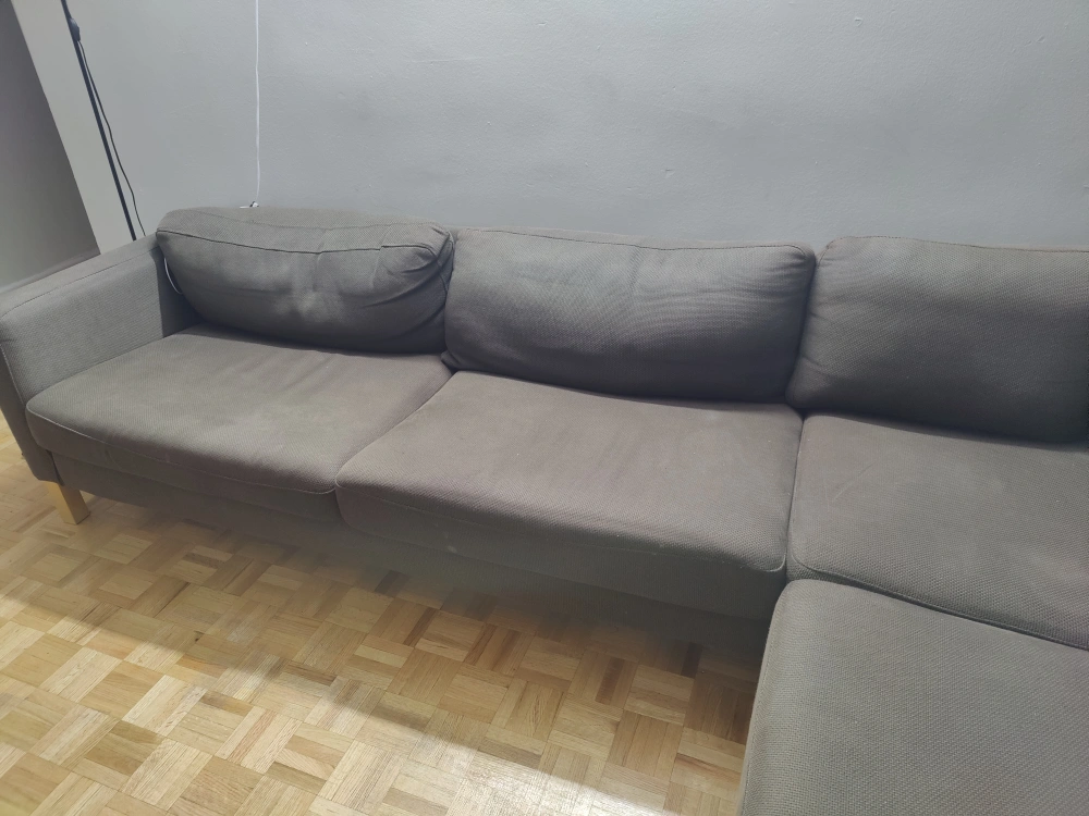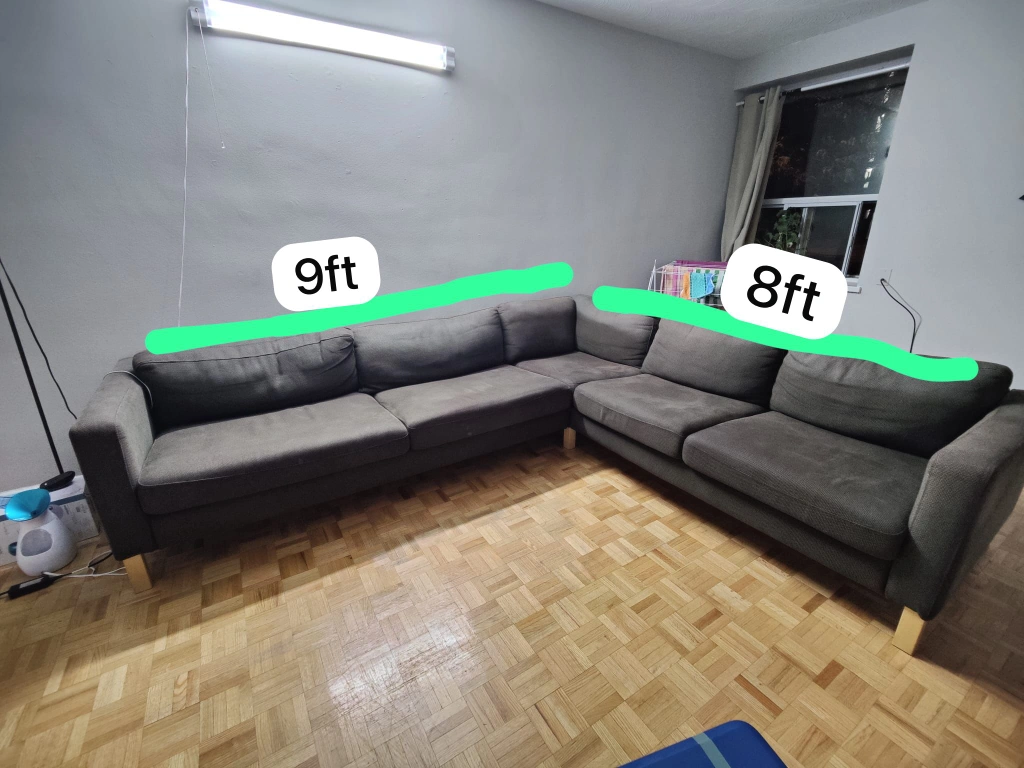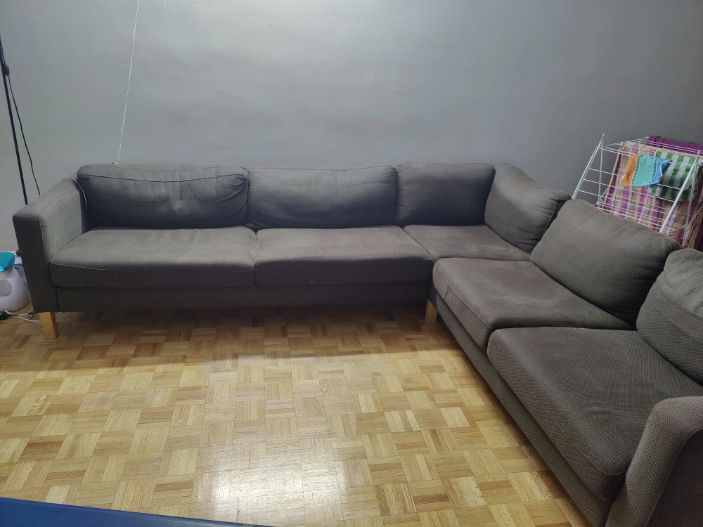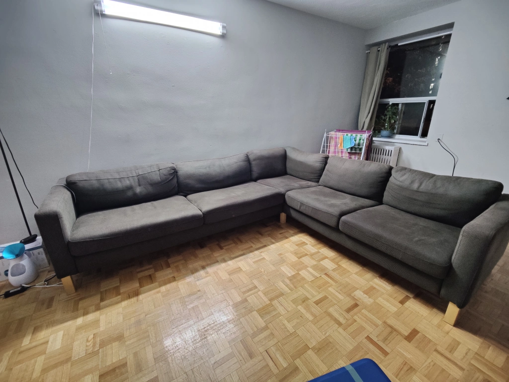 90Grey sectional couch. 9ft x 8ft. Good condition. Has some wear and tear but is very comfortable.