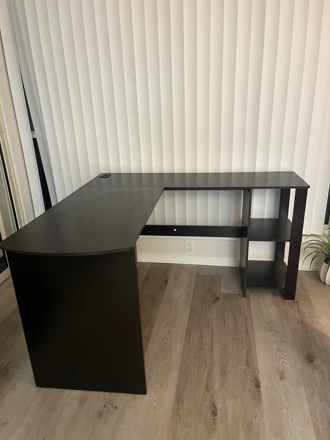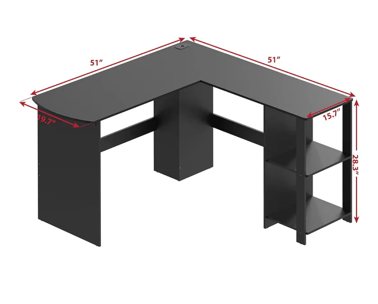 15Selling a black L-shaped corner desk. It's in great condition and perfect for a home office or study space. The dimensions are approximately 51" x 51" with a height of 28.3". It also has some shelving for extra storage!