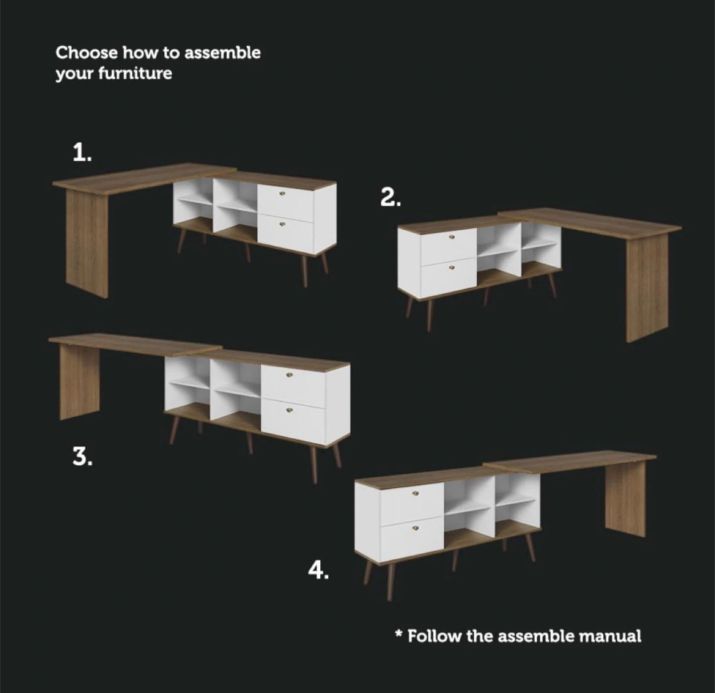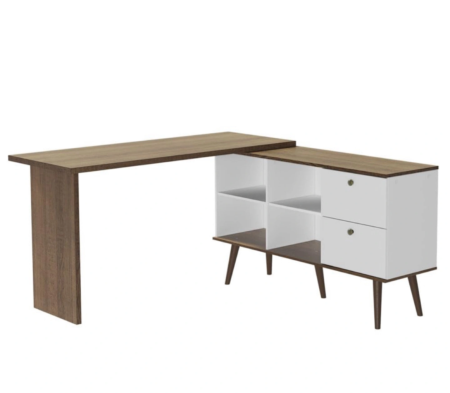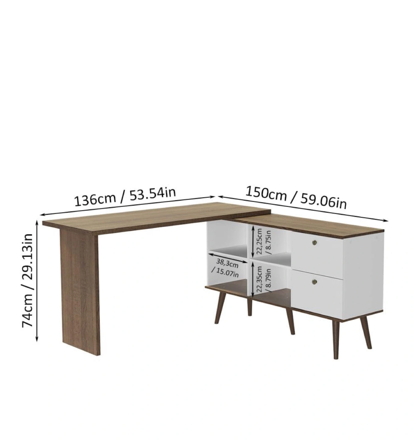 Looking to sell this L-shaped corner desk. It's in great condition and would be perfect for a home office or study space. - Dimensions: 136cm x 150cm (53.54in x 59.06in) wide, 74cm (29.13in) high - Features shelves and drawers for storage - Colour: Brown and white