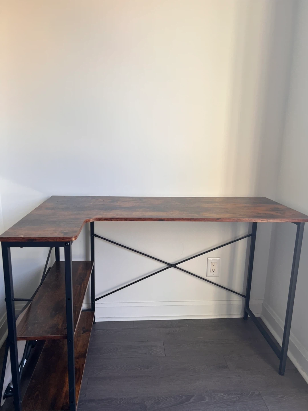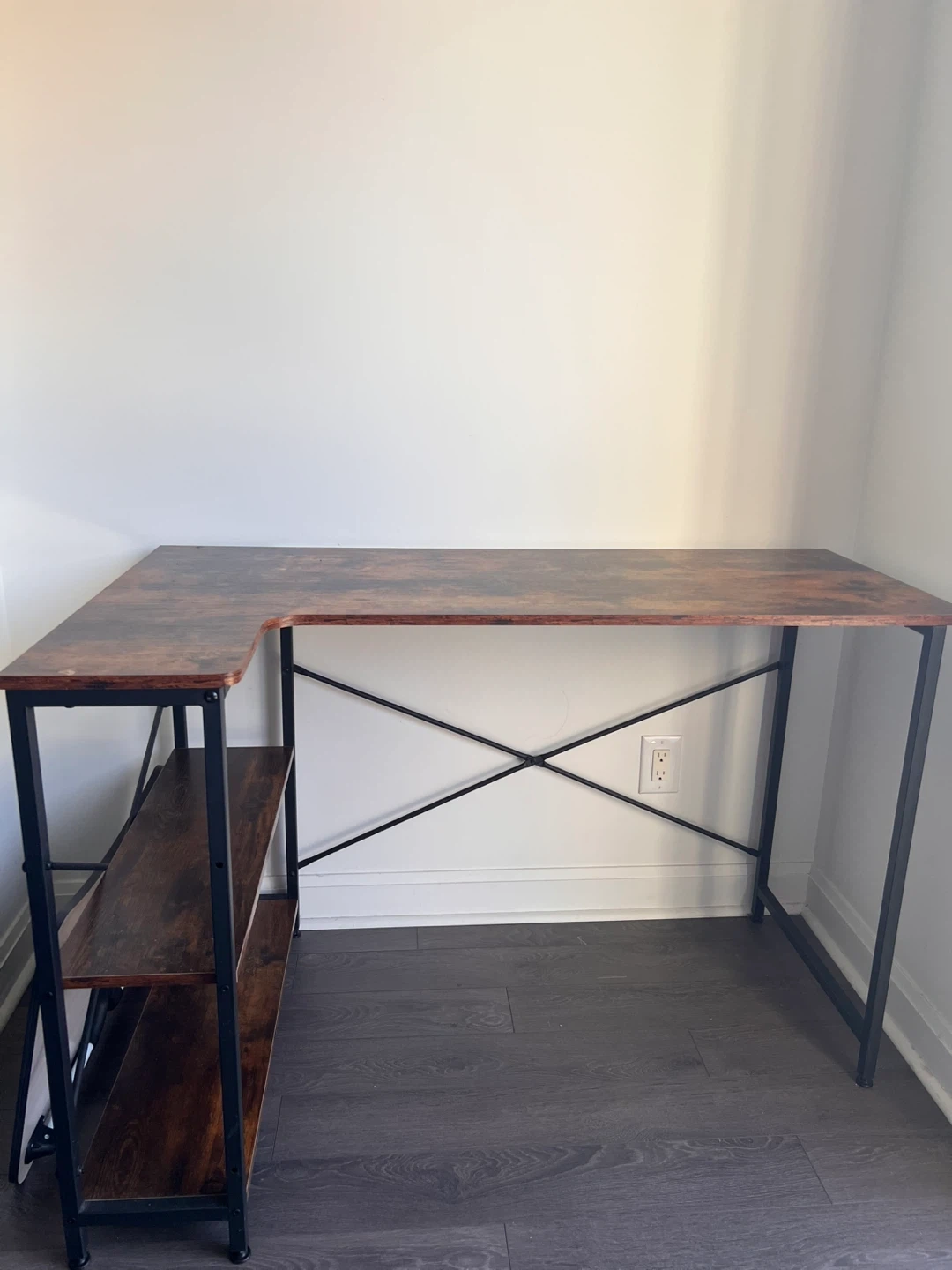 10Looking to sell this L-shaped corner desk! It's in great shape and has a nice wood-look finish with black metal legs. It also has built-in shelves on one side for extra storage. Perfect for a home office or study space!