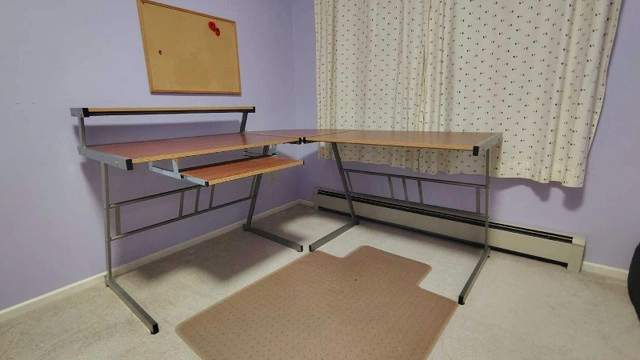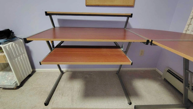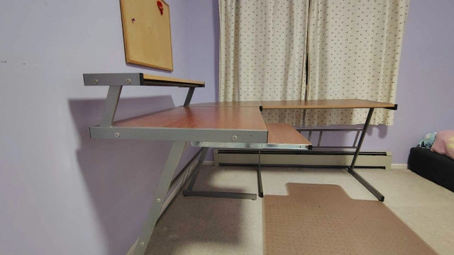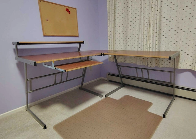 68This is a used L-shaped desk that's perfect for a home office or study area, offering ample workspace and a unique design. Its layout allows for efficient use of corner spaces. It does show signs of wear, but it is still in good working condition. It's ready to be the command center for your next big project or gaming marathon. * L-shaped design * Silver frame * Wood grain surface The price is set at $75, reflecting its value as a practical and functional piece. If you're seeing this ad, then yes, it's still available! It can also be used as 2 desks of 24" x 37" with computer monitor stand, slide out keyboard tray and hanging file unit.