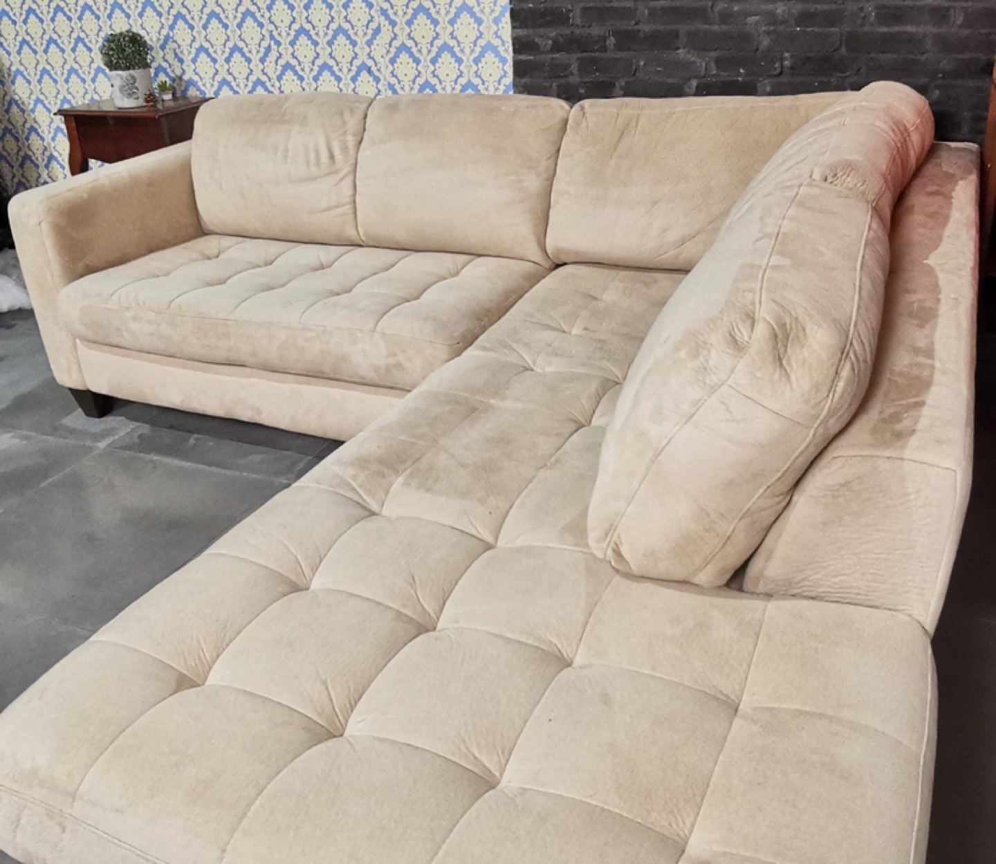 15Hello neighbours, this Natuzzi brand L-shaped sofa has no wear and tear. In fact, it is in perfect shape and condition as it is well maintained. Procedure: Velvet Status: Second hand Dimensions : Length1 : 220cm 87" Length 2 : 140cm 55" Width : 94cm 37" Height : 71cm 28" The Italian Natuzzi brand is famous worldwide for its luxurious and high-quality sofas. The brand is also recognized as the furniture brand among luxury goods consumers. The cream colour of the used Natuzzi sofa will make your living room spacious and fresh. Also, it is suitable for bright interiors. The versatility and adaptability of this elegant sofa make it a flexible piece of furniture because an L-shaped sofa is socially inviting and can be customized and modified according to the shape of your room.
