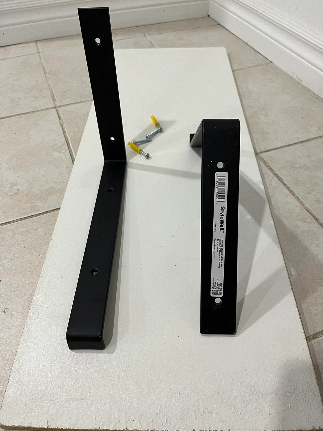 83Two black L-shaped steel shelf brackets. Size 10 inches. Supports are in the shape of an L.