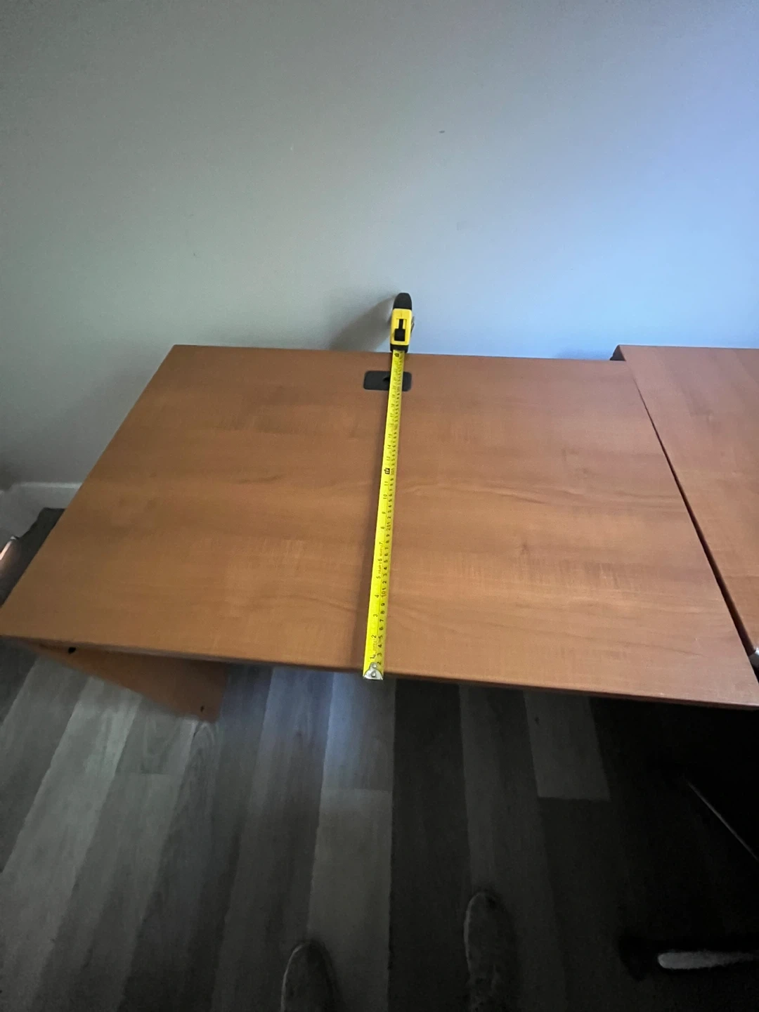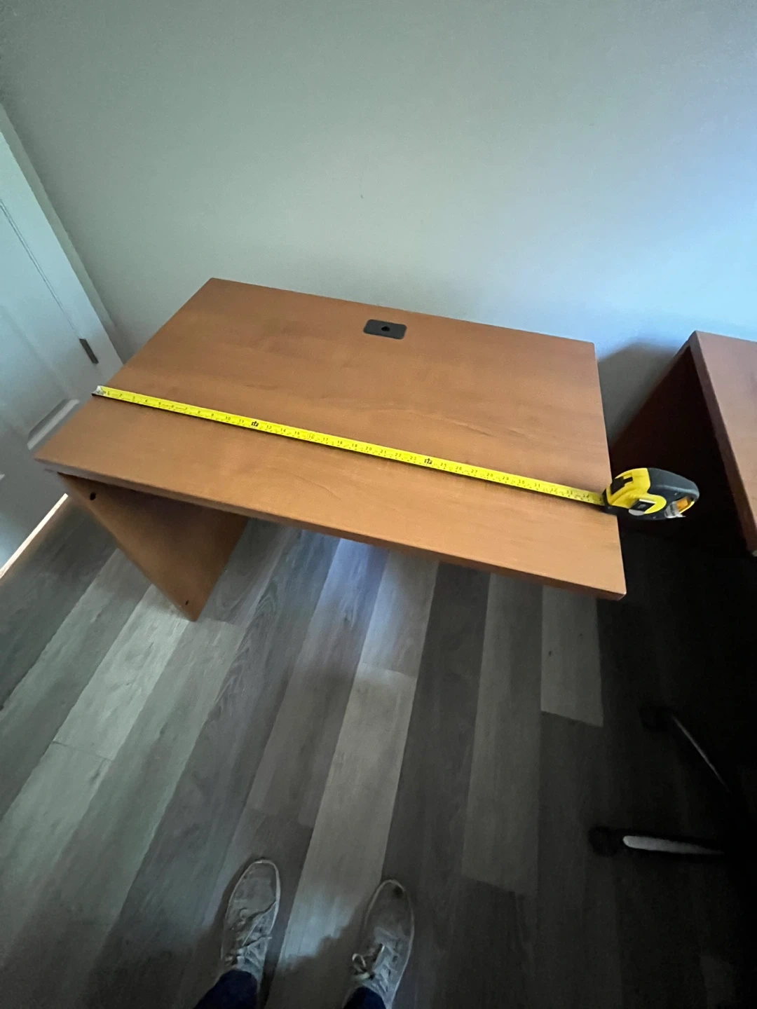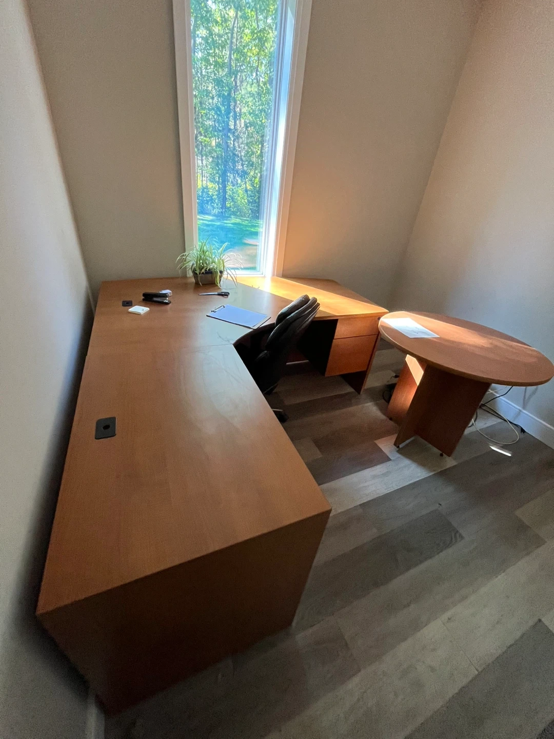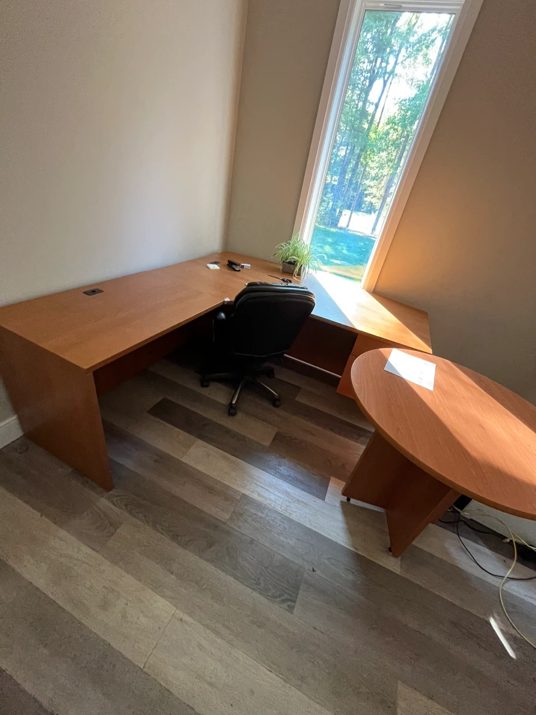 Selling a spacious L-shaped wooden desk, perfect for a home office or study! It comes with a removable side extension. The desk features a cutout for cable management. Some Measurements are shown in the pictures.