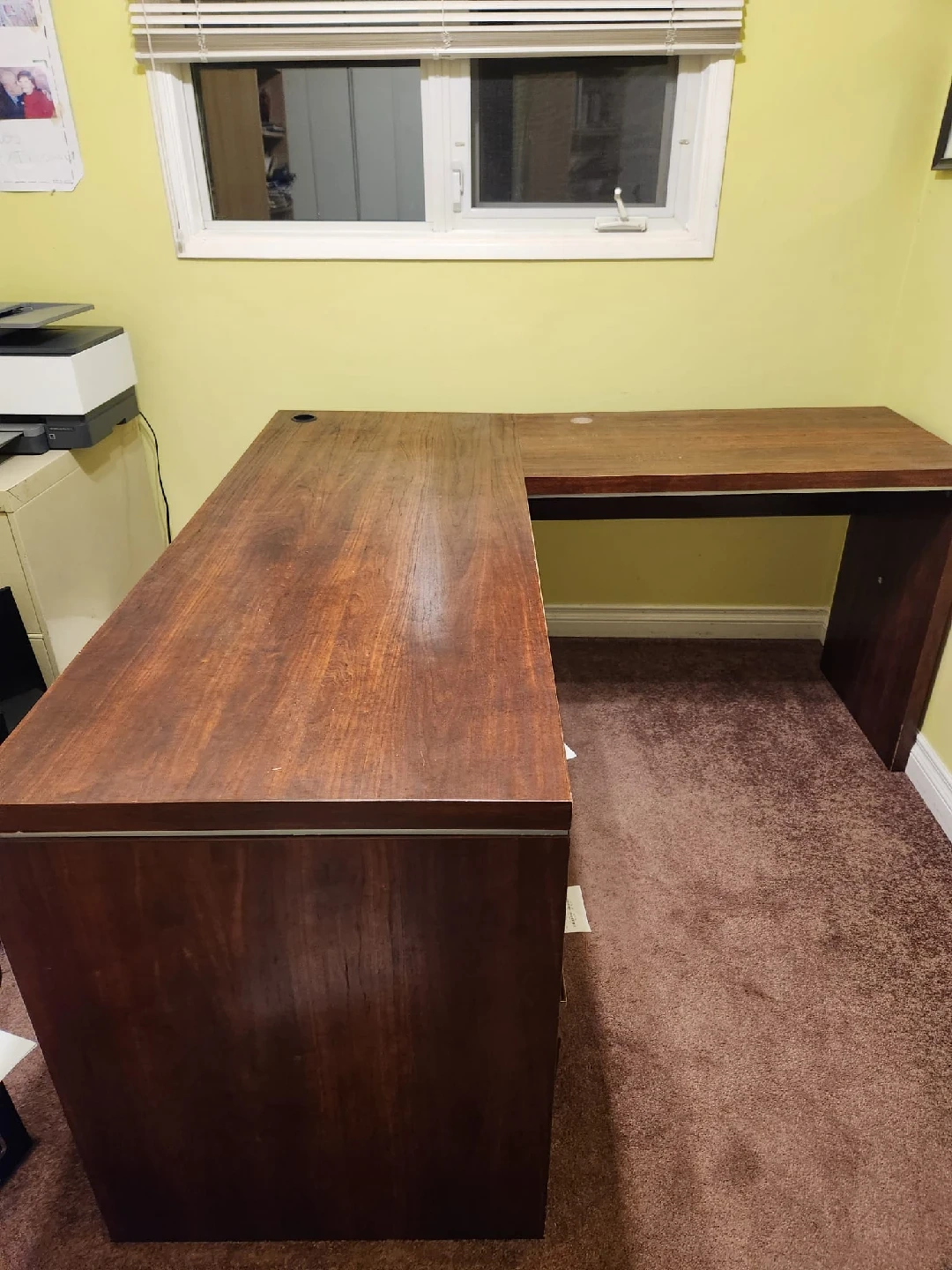 10Selling a lovely L-shaped wooden desk! It's a great addition to any home office or study space. The desk appears to be in good condition and has a rich, dark wood finish. Perfect for maximizing corner space and providing ample workspace and it has drawers on the sides to store everything