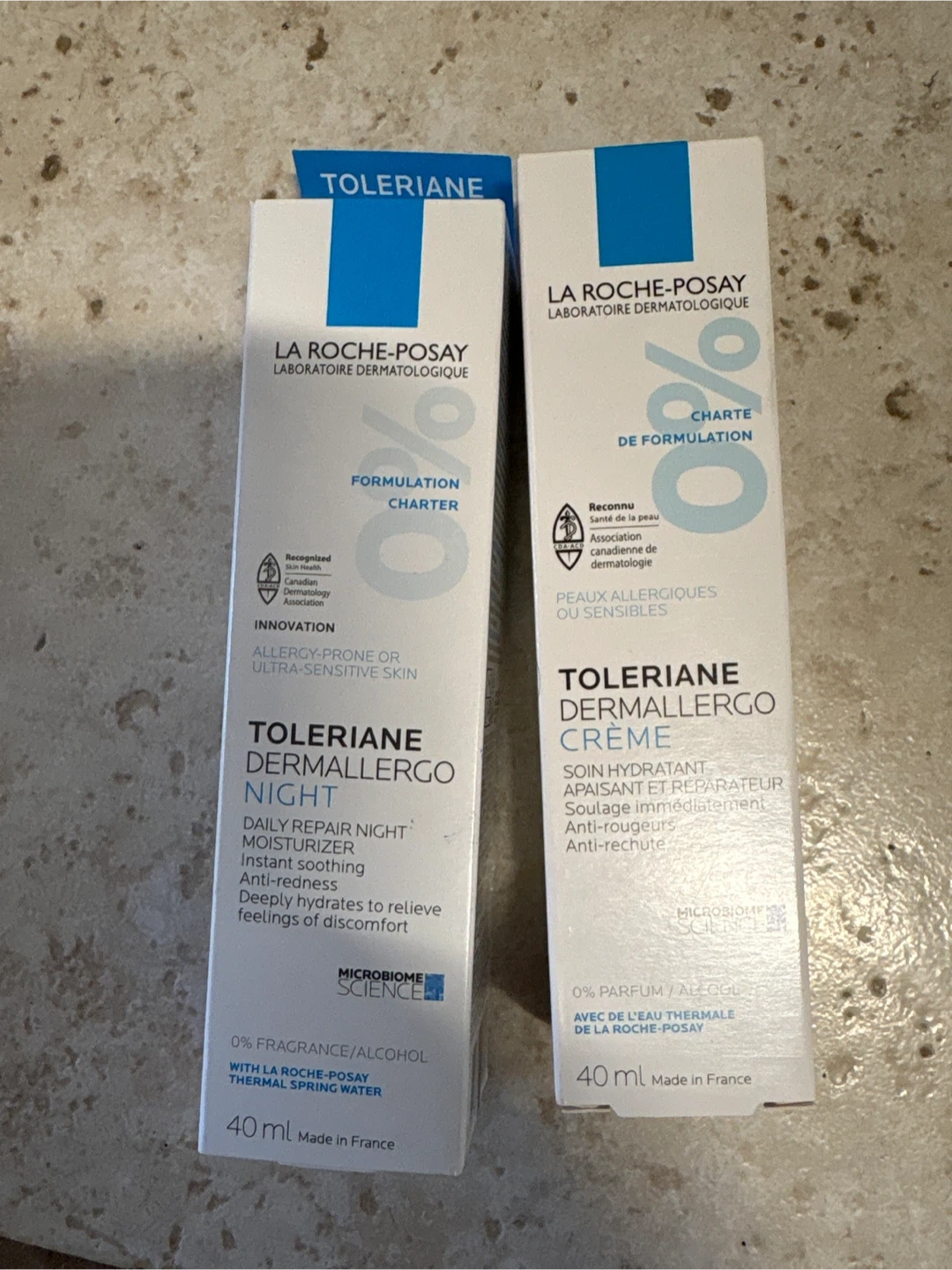 Selling La Roche-Posay Toleriane Dermallergo Night Daily Repair Night Moisturizer and Toleriane Dermallergo Creme. Both are formulated for allergy-prone or ultra-sensitive skin. Each bottle contains 40ml and is made in France. They are both 0% fragrance/alcohol and contain La Roche-Posay thermal spring water. The night moisturizer deeply hydrates to relieve feelings of discomfort, and the creme is a soothing and repairing hydratant