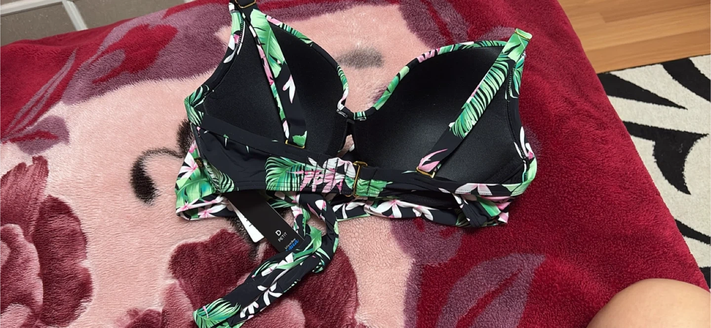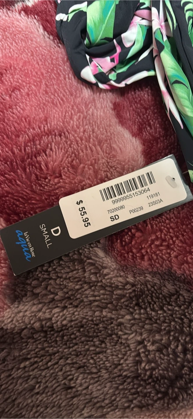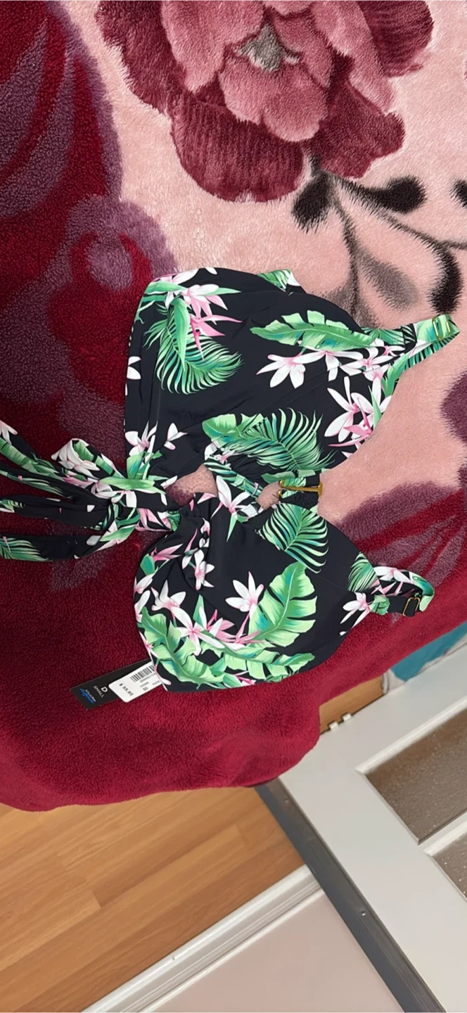 This is a brand new La Vie en Rose Aqua bikini top. It's a size small and still has the tags on it! The original price was $55.95. It features a beautiful tropical floral print on a black background. Size is SD.